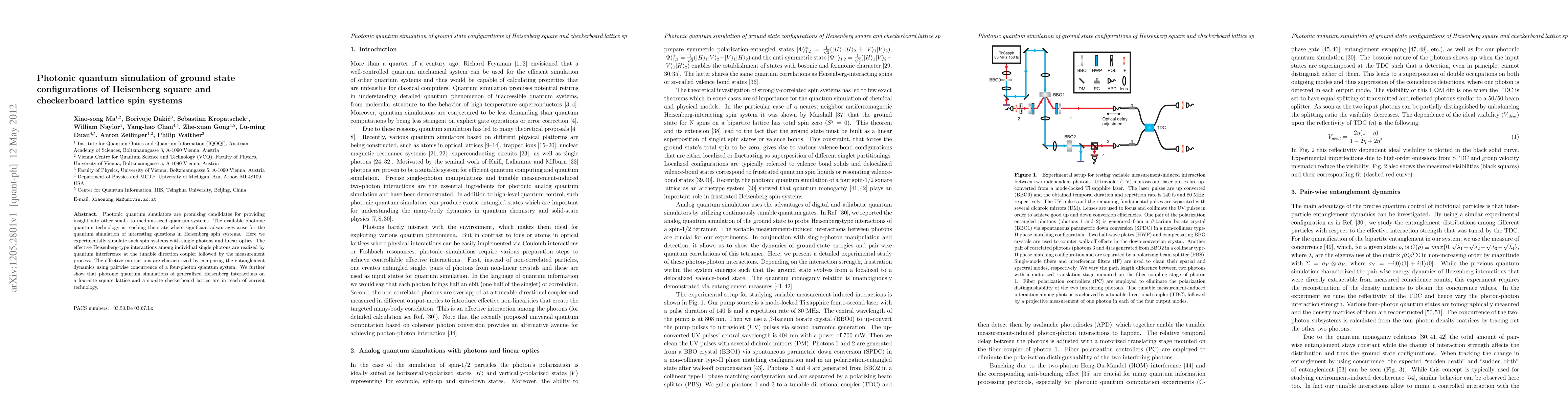 This paper demonstrates the experimental simulation of ground state configurations in Heisenberg spin systems using photonic quantum simulators with single photons and linear optics. The study shows that effective Heisenberg-type interactions can be realized through quantum interference and measurement, and it confirms the feasibility of simulating generalized Heisenberg interactions on small lattices with current technology.
