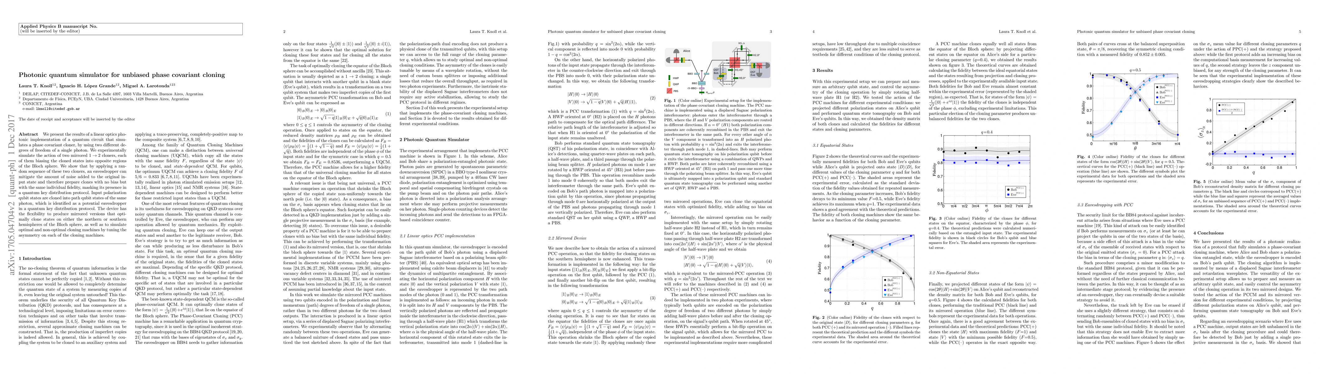 This research develops a photonic quantum simulator that employs linear optics to simulate phase covariant cloning, using a single photon's degrees of freedom. The system can mitigate noise in quantum key distribution by randomly applying mirrored $1\rightarrow 2$ cloners, thus preparing unbiased clones while maintaining fidelity.