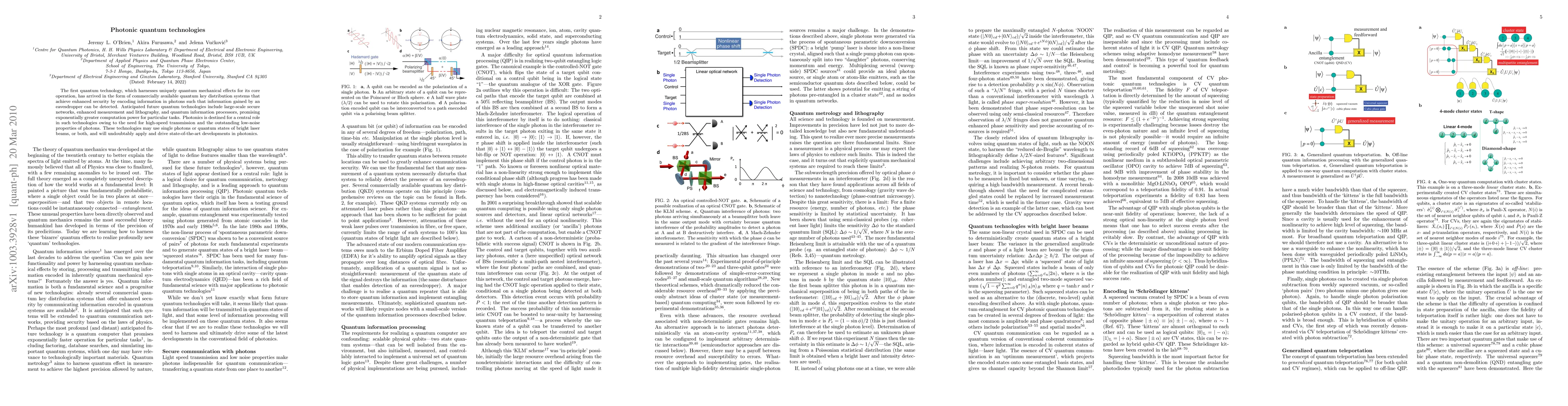 The first quantum technology, which harnesses uniquely quantum mechanical effects for its core operation, has arrived in the form of commercially available quantum key distribution systems that achieve enhanced security by encoding information in photons such that information gained by an eavesdropper can be detected. Anticipated future quantum technologies include large-scale secure networks, enhanced measurement and lithography, and quantum information processors, promising exponentially greater computation power for particular tasks. Photonics is destined for a central role in such technologies owing to the need for high-speed transmission and the outstanding low-noise properties of photons. These technologies may use single photons or quantum states of bright laser beams, or both, and will undoubtably apply and drive state-of-the-art developments in photonics.