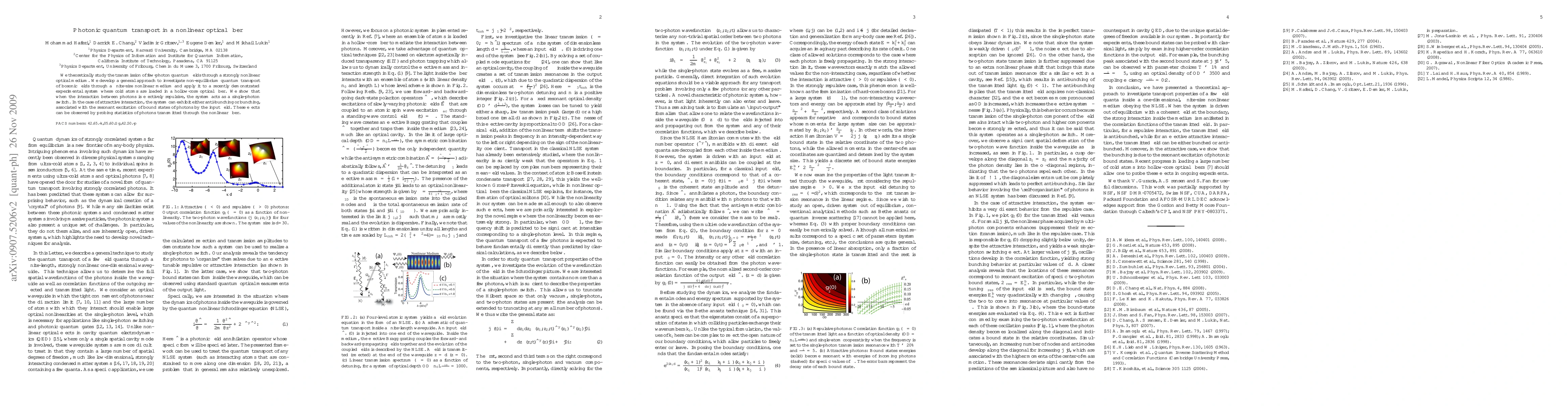 This paper theoretically investigates the quantum transport of few-photon fields through a nonlinear optical fiber, demonstrating that repulsive photon interactions can act as a single-photon switch, while attractive interactions can lead to anti-bunching or bunching, observable through photon statistics.