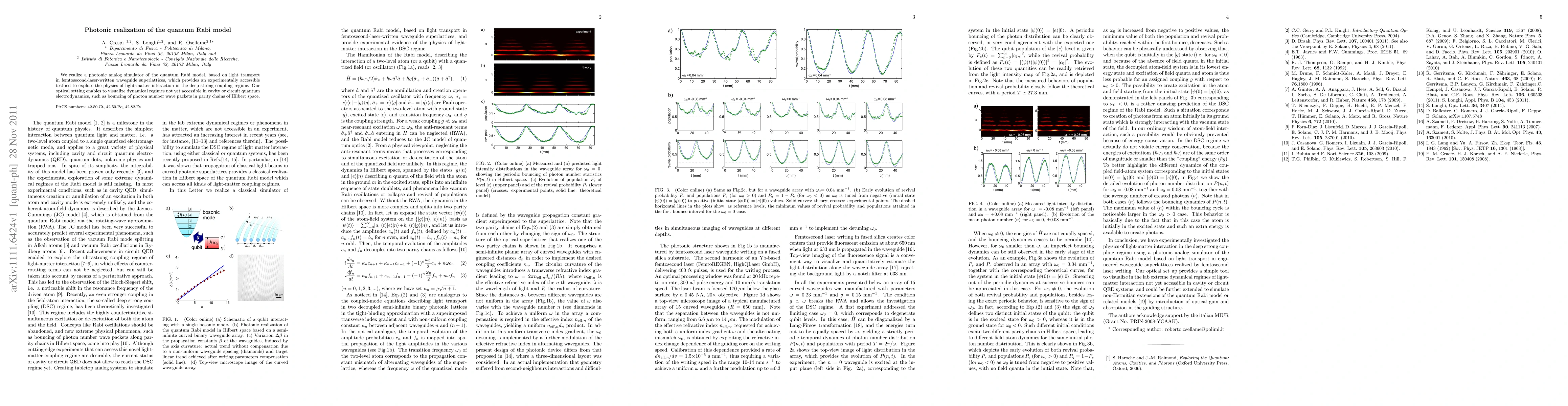 This paper presents a photonic analog simulator for the quantum Rabi model using femtosecond-laser-written waveguide superlattices, offering a novel platform to study light-matter interaction in the strong coupling regime. The optical setup allows visualization of unique dynamical regimes, such as photon number wave packet bouncing in parity chains, not accessible in traditional cavity or circuit quantum electrodynamics.