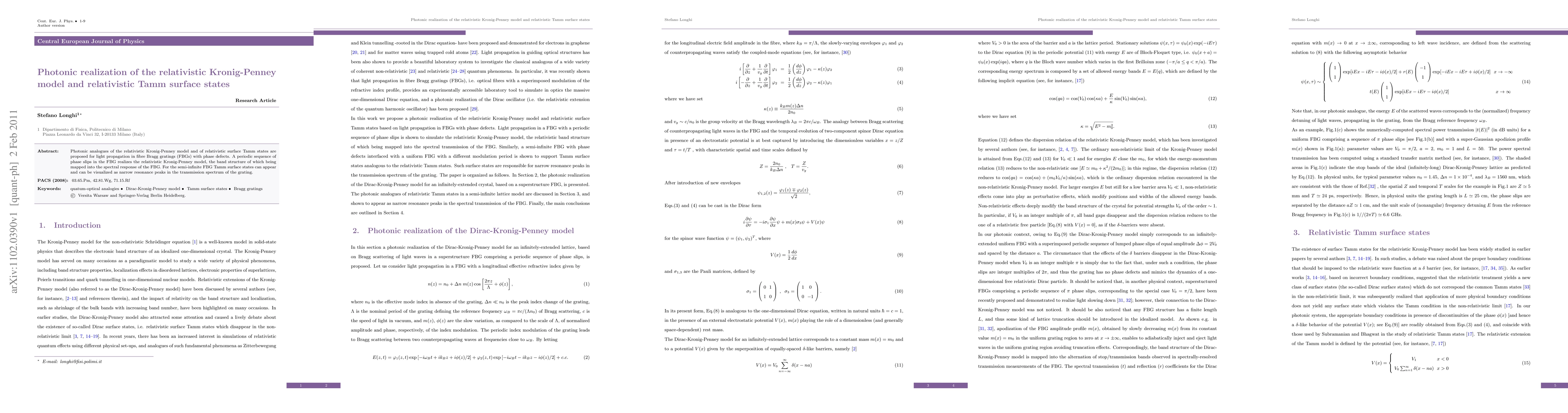 This paper proposes photonic analogues of the relativistic Kronig-Penney model and Tamm surface states using fibre Bragg gratings with phase defects. The periodic phase slips in the FBG mimic the relativistic Kronig-Penney model, while Tamm surface states manifest as narrow resonance peaks in the FBG's transmission spectrum.
