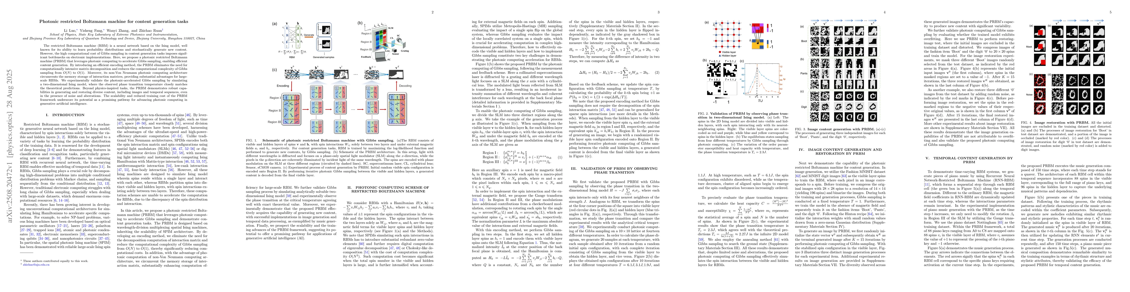 The restricted Boltzmann machine (RBM) is a neural network based on the Ising model, well known for its ability to learn probability distributions and stochastically generate new content. However, the high computational cost of Gibbs sampling in content generation tasks imposes significant bottlenecks on electronic implementations. Here, we propose a photonic restricted Boltzmann machine (PRBM) that leverages photonic computing to accelerate Gibbs sampling, enabling efficient content generation. By introducing an efficient encoding method, the PRBM eliminates the need for computationally intensive matrix decomposition and reduces the computational complexity of Gibbs sampling from $O(N)$ to $O(1)$. Moreover, its non-Von Neumann photonic computing architecture circumvents the memory storage of interaction matrices, providing substantial advantages for large-scale RBMs. We experimentally validate the photonic-accelerated Gibbs sampling by simulating a two-dimensional Ising model, where the observed phase transition temperature closely matches the theoretical predictions. Beyond physics-inspired tasks, the PRBM demonstrates robust capabilities in generating and restoring diverse content, including images and temporal sequences, even in the presence of noise and aberrations. The scalability and reduced training cost of the PRBM framework underscore its potential as a promising pathway for advancing photonic computing in generative artificial intelligence.