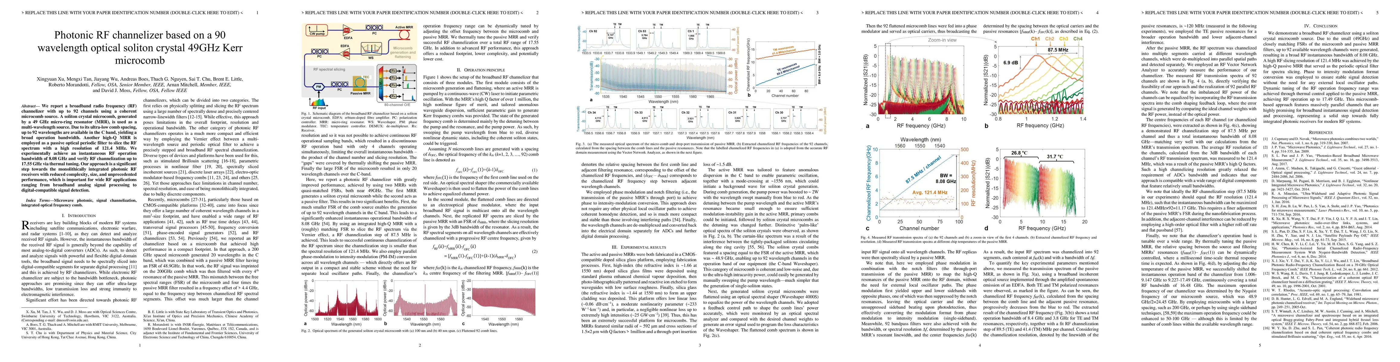 This research presents a broadband RF channelizer utilizing a 49 GHz Kerr microcomb soliton crystal for generating up to 92 channels within the C band, combined with a high-Q micro-ring resonator filter for precise RF spectrum slicing. The system demonstrates an operational bandwidth of 8.08 GHz and potential for integration into compact, high-performance photonic RF receivers.