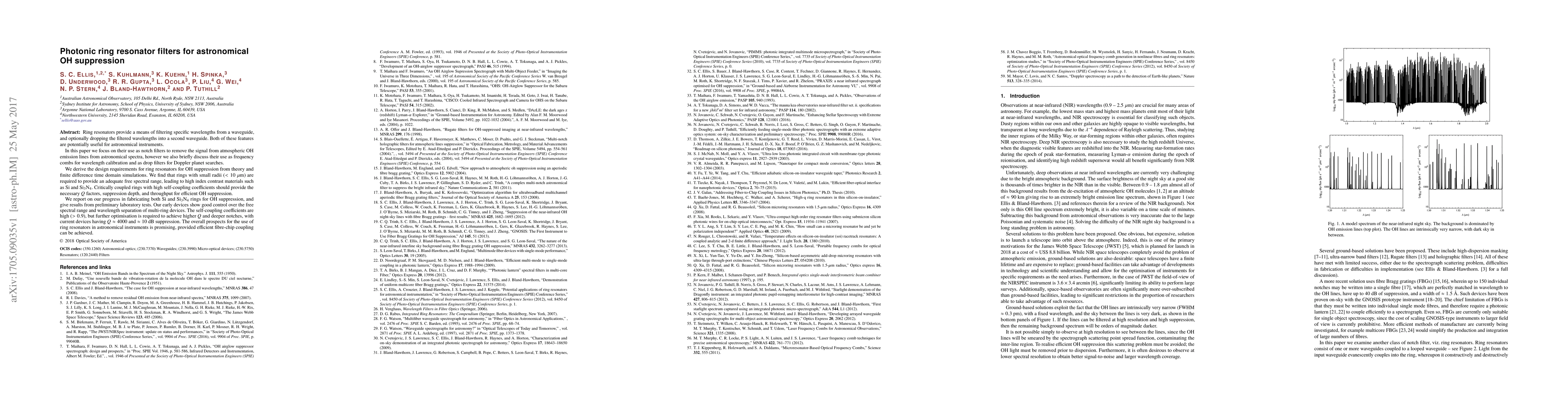 This paper explores the use of photonic ring resonator filters to suppress atmospheric OH emission lines in astronomical spectra. The design requirements for effective OH suppression are derived, emphasizing the need for small radii and high index contrast materials, with Si and Si$_{3}$N$_{4}$ being optimal. Preliminary tests show promising results with high self-coupling coefficients and moderate Q factors, though further optimization is needed for better performance.