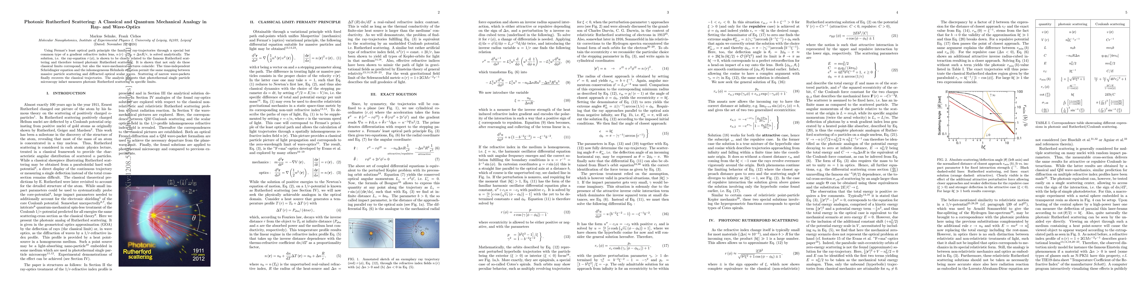 Using Fermat's least optical path principle the family of ray-trajectories through a special but common type of a gradient refractive index lens, n(r)=n_0+\Delta n R/r, is solved analytically. The solution, i.e. the ray-equation r(phi), is shown to be closely related to the famous Rutherford scattering and therefore termed photonic Rutherford scattering. It is shown that not only do these classical limits correspond, but also the wave-mechanical pictures coincide: The time-independent Schr\"odingier equation and the inhomogeneous Helmholz equation permit the same mapping between massive particle scattering and diffracted optical scalar waves. Scattering of narrow wave-packets finally recovers the classical trajectories. The analysis suggests that photothermal single particle microscopy infact measures photonic Rutherford scattering in specific limits.