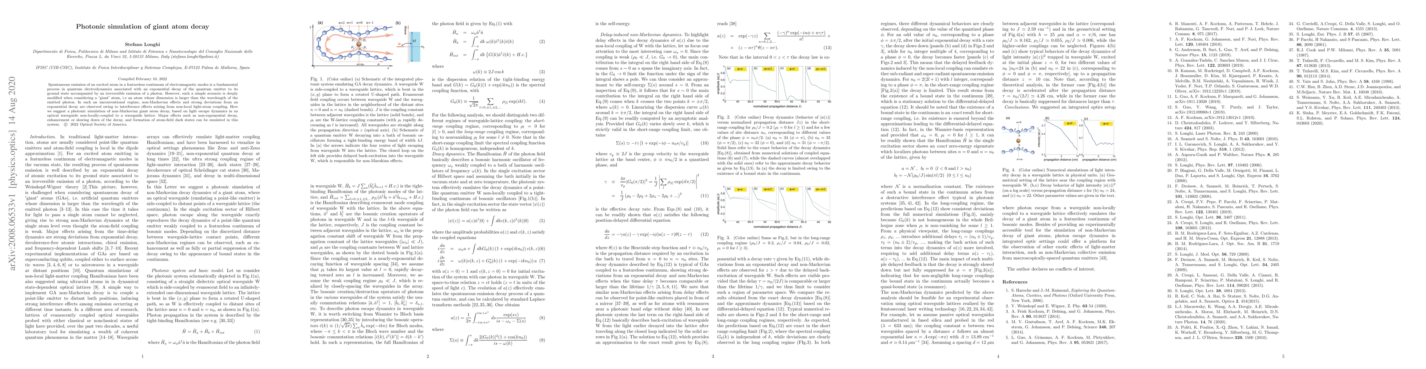 This paper explores the photonic simulation of the decay of a "giant atom," where the atom's size exceeds the emitted photon's wavelength, leading to non-Markovian effects. The study proposes a photonic model using light dynamics in a non-locally coupled waveguide lattice to emulate phenomena like non-exponential decay and the formation of dark states.