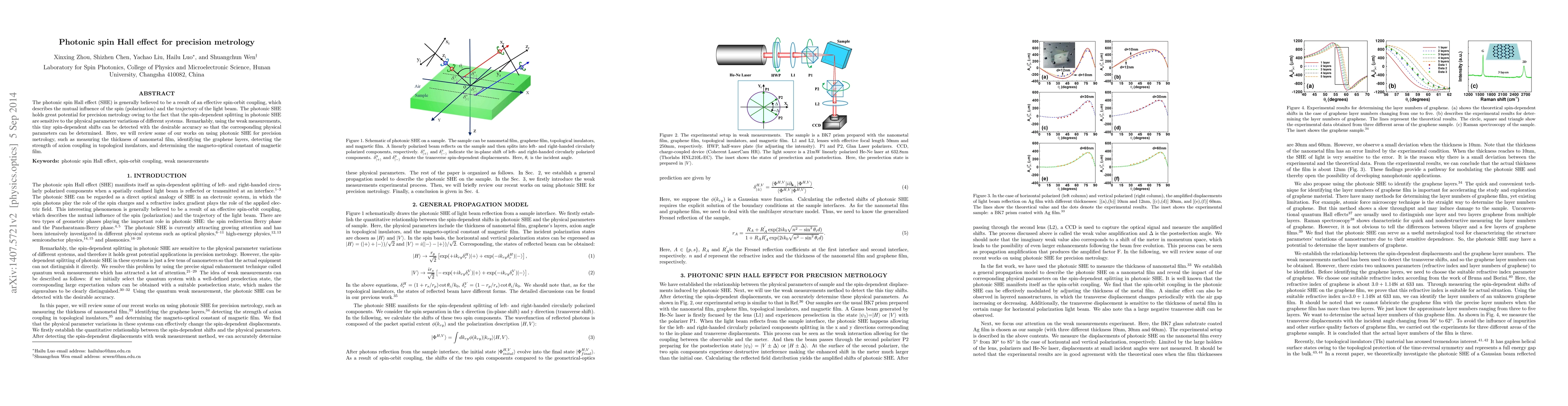 The photonic spin Hall effect (SHE) leverages spin-orbit coupling to enable precise metrology by detecting tiny spin-dependent shifts, which are sensitive to physical parameter variations. This method has been applied to measure nanometal film thickness, identify graphene layers, detect axion coupling in topological insulators, and determine the magneto-optical constant of magnetic films.