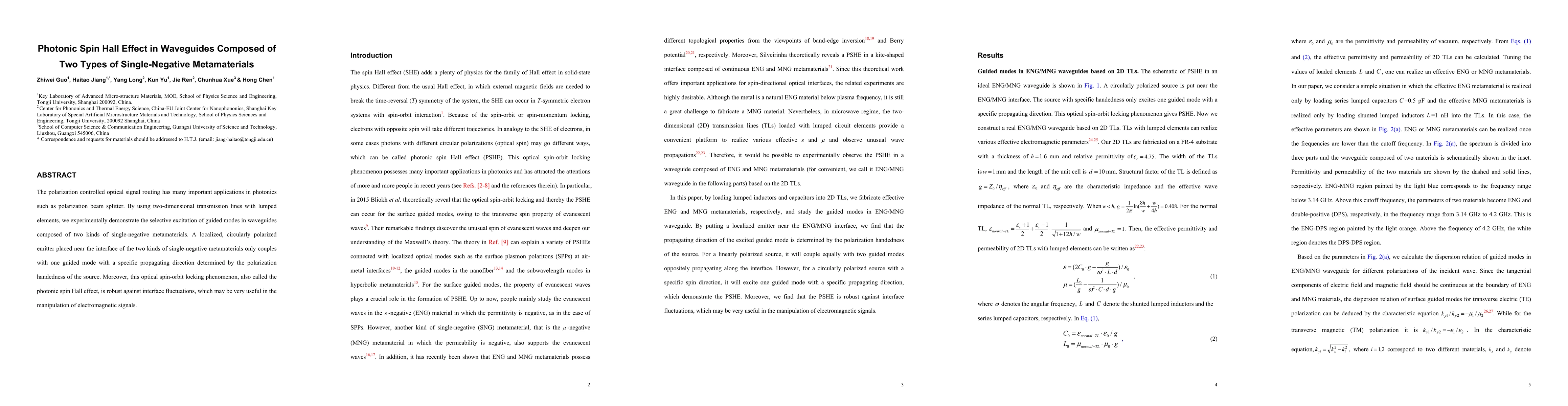 The polarization controlled optical signal routing has many important applications in photonics such as polarization beam splitter. By using two-dimensional transmission lines with lumped elements, we experimentally demonstrate the selective excitation of guided modes in waveguides composed of two kinds of single-negative metamaterials. A localized, circularly polarized emitter placed near the interface of the two kinds of single-negative metamaterials only couples with one guided mode with a specific propagating direction determined by the polarization handedness of the source. Moreover, this optical spin-orbit locking phenomenon, also called the photonic spin Hall effect, is robust against interface fluctuations, which may be very useful in the manipulation of electromagnetic signals.