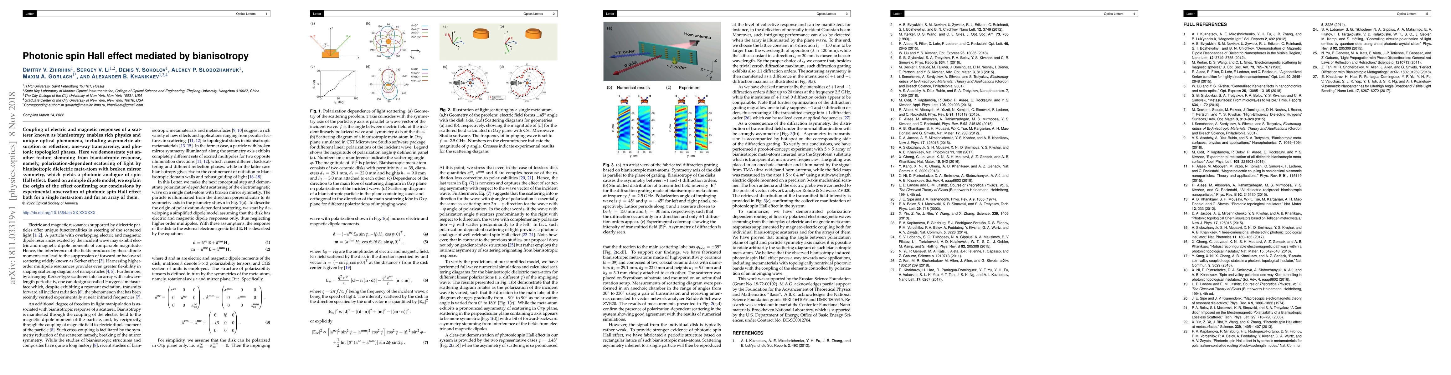 The paper demonstrates a photonic spin Hall effect mediated by bianisotropy in dielectric meta-atoms with broken mirror symmetry, showcasing polarization-dependent light scattering. Theoretical modeling and experimental observations confirm this novel optical phenomenon.