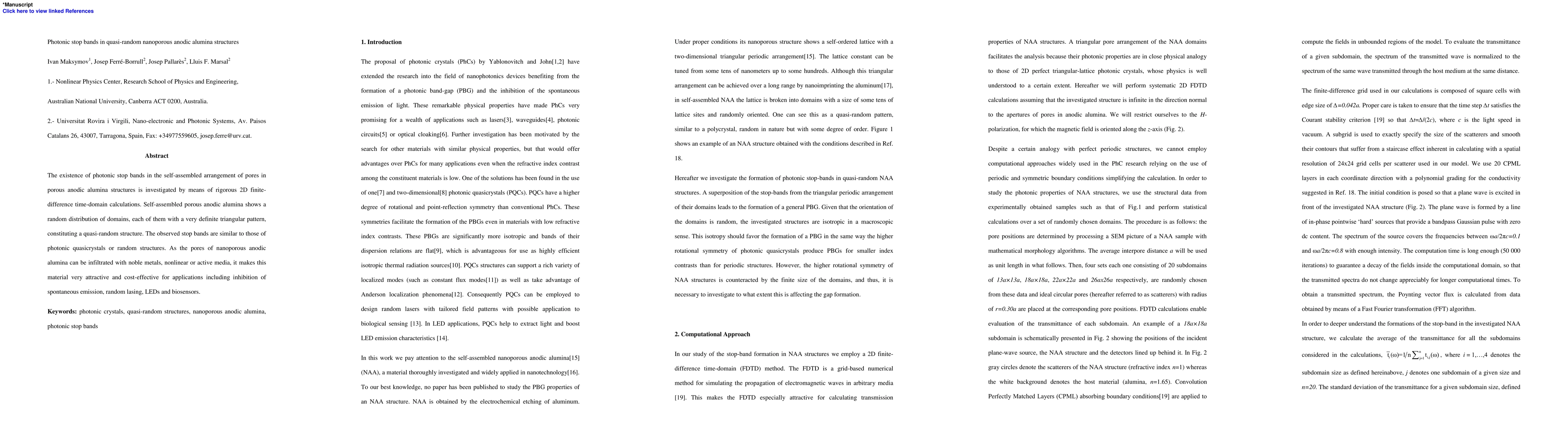 This paper investigates photonic stop bands in quasi-random nanoporous anodic alumina structures using 2D finite-difference time-domain calculations. The study finds that these structures exhibit stop bands similar to photonic quasicrystals, making them promising for applications in inhibition of spontaneous emission, random lasing, LEDs, and biosensors.