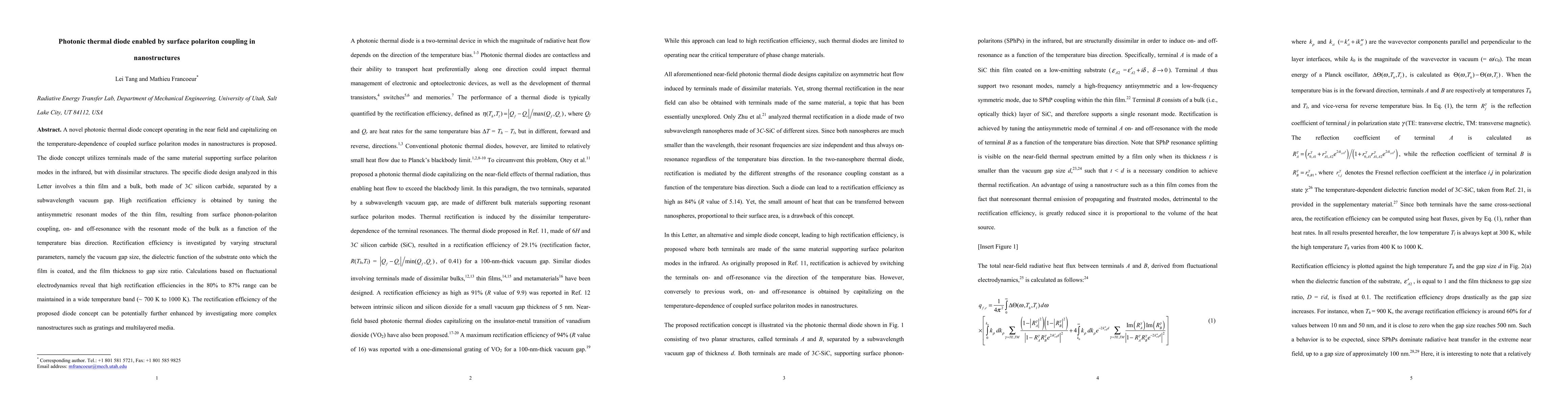 This paper proposes a photonic thermal diode utilizing surface polariton coupling in nanostructures, achieving high rectification efficiency through temperature-dependent resonant modes in 3C silicon carbide. The design, involving a thin film and bulk separated by a vacuum gap, shows rectification efficiencies of 80% to 87% over a wide temperature range, suggesting potential for further enhancement with more complex nanostructures.