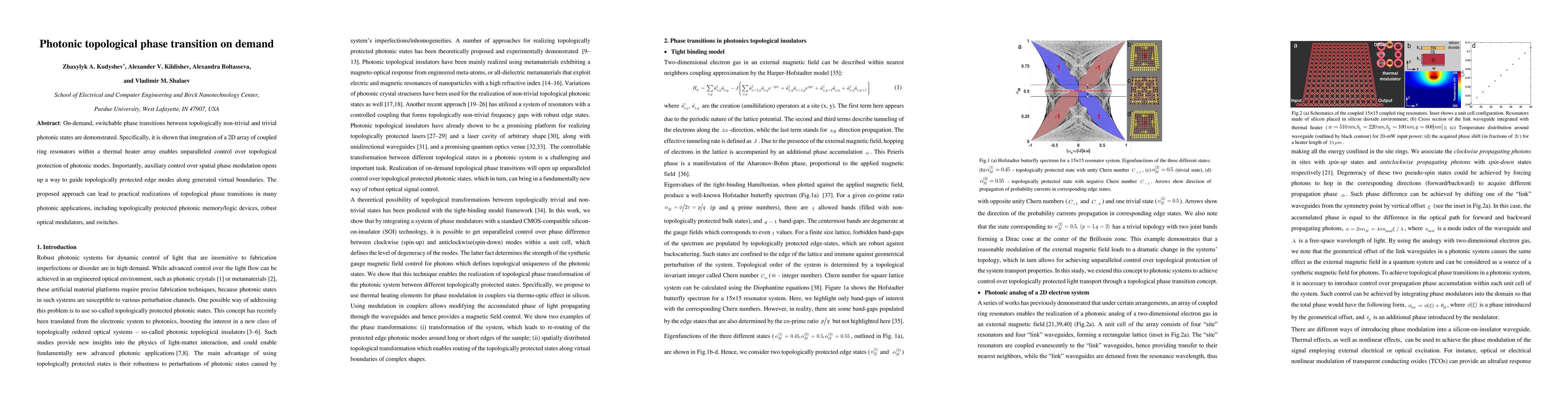 This paper demonstrates on-demand control over photonic topological phase transitions using a 2D array of coupled ring resonators integrated with a thermal heater array, enabling switchable topological protection and guiding of edge modes. This approach has potential applications in photonic memory, logic devices, and robust optical modulators.
