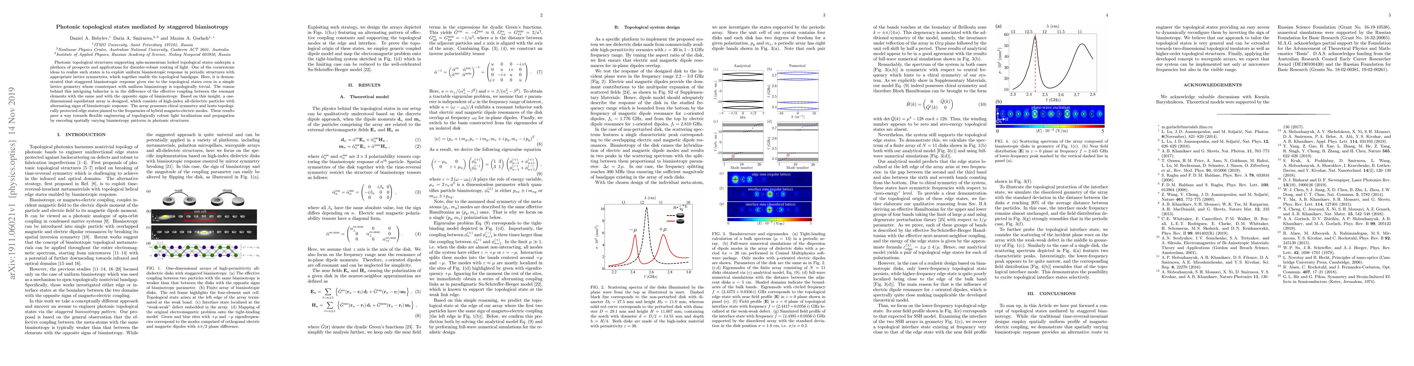 This paper demonstrates that staggered bianisotropy in a simple lattice geometry can generate topological photonic states, unlike uniform bianisotropy. The study designs a one-dimensional array of dielectric particles with alternating bianisotropy signs, revealing topologically protected edge states, which opens new avenues for robust light routing.