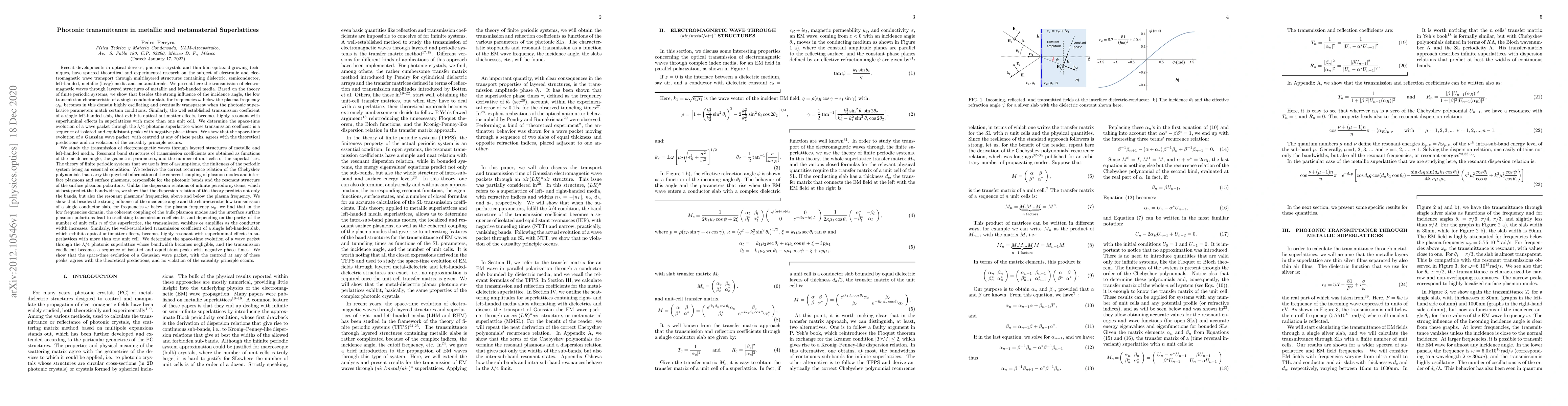 We present here the transmission of electromagnetic waves through layered structures of metallic and left-handed media. Based on the theory of finite periodic systems, we show that besides the strong influence of the incidence angle, the low transmission characteristic of a single conductor slab, for frequencies $\omega$ below the plasma frequency $\omega_p$, becomes in this domain highly oscillating. Similarly, the well-established transmission coefficient of a single left-handed slab becomes highly resonant with superluminal effects in superlattices with more than one unit cell. We determine the space-time evolution of a wave packet through the $\lambda/4$ photonic superlattice whose transmission coefficient is a sequence of isolated and equidistant peaks with negative phase times. We show that the space-time evolution of a Gaussian wave packet, with centroid at any of these peaks, agrees with the theoretical predictions, and no violation of the causality principle occurs. We show that besides the strong influence of the incidence angle, the coherent coupling of the bulk plasmon modes and the interface surface plasmon polaritons lead to oscillating transmission coefficients, and depending on the parity of the number of unit cells $n$ of the superlattice, the transmission vanishes or amplifies as the conductor width increases. We determine the space-time evolution of a wave packet through the $\lambda/4$ photonic superlattice whose bandwidth becomes negligible, and the transmission coefficient becomes a sequence of isolated and equidistant peaks with negative phase times. We show that the space-time evolution of a Gaussian wave packet, with the centroid at any of these peaks, agrees with the theoretical predictions, and no violation of the causality principle occurs.