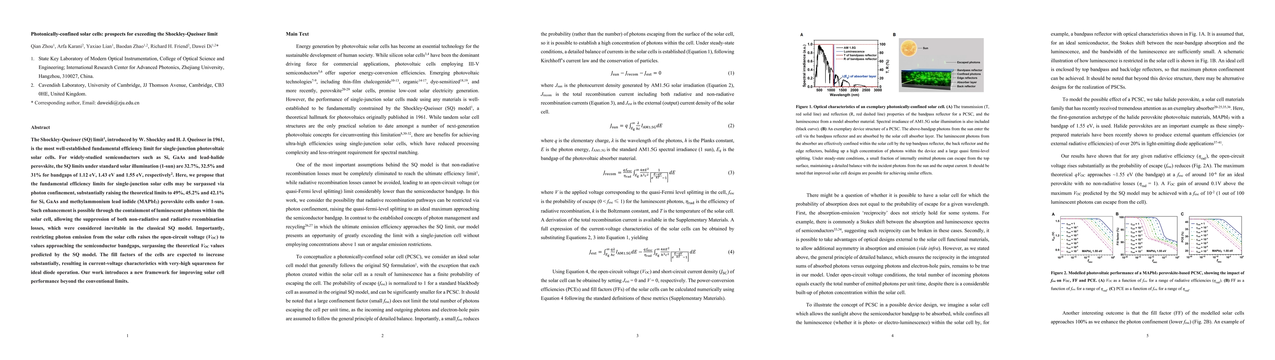 This paper proposes a method to exceed the Shockley-Queisser efficiency limit for single-junction solar cells through photon confinement, raising theoretical efficiency limits to 49%, 45.2%, and 42.1% for Si, GaAs, and MAPbI3 perovskite cells respectively. The approach aims to suppress recombination losses and enhance open-circuit voltage and fill factors, offering a new framework for solar cell performance improvement.