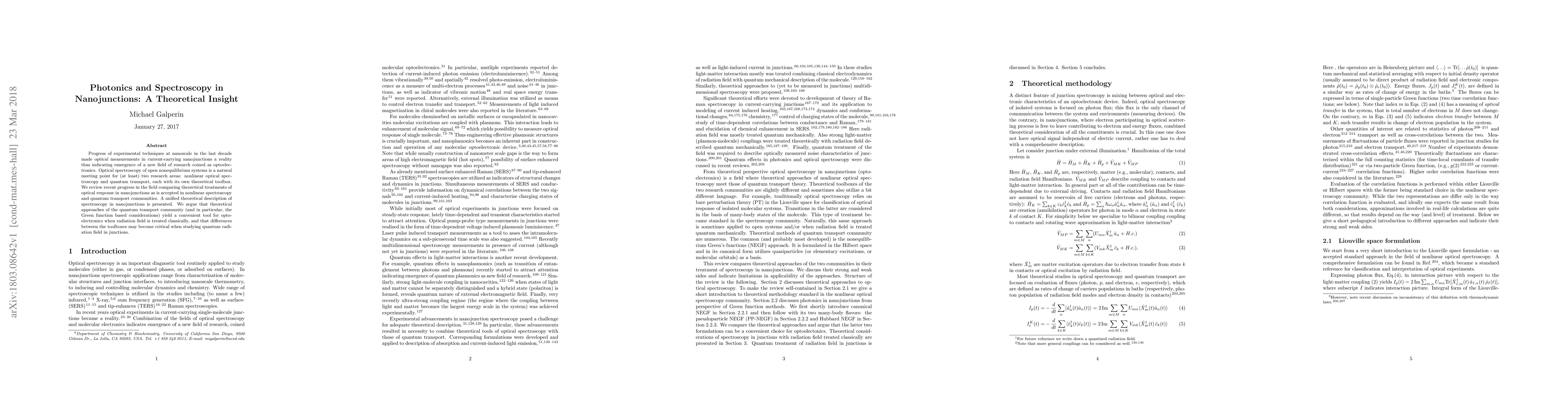 This paper reviews recent advancements in optical spectroscopy of nanojunctions, highlighting the convergence of nonlinear optical spectroscopy and quantum transport theories. It advocates for the use of Green function-based quantum transport approaches for classical radiation fields, while noting potential discrepancies when quantum effects in the radiation field are considered.