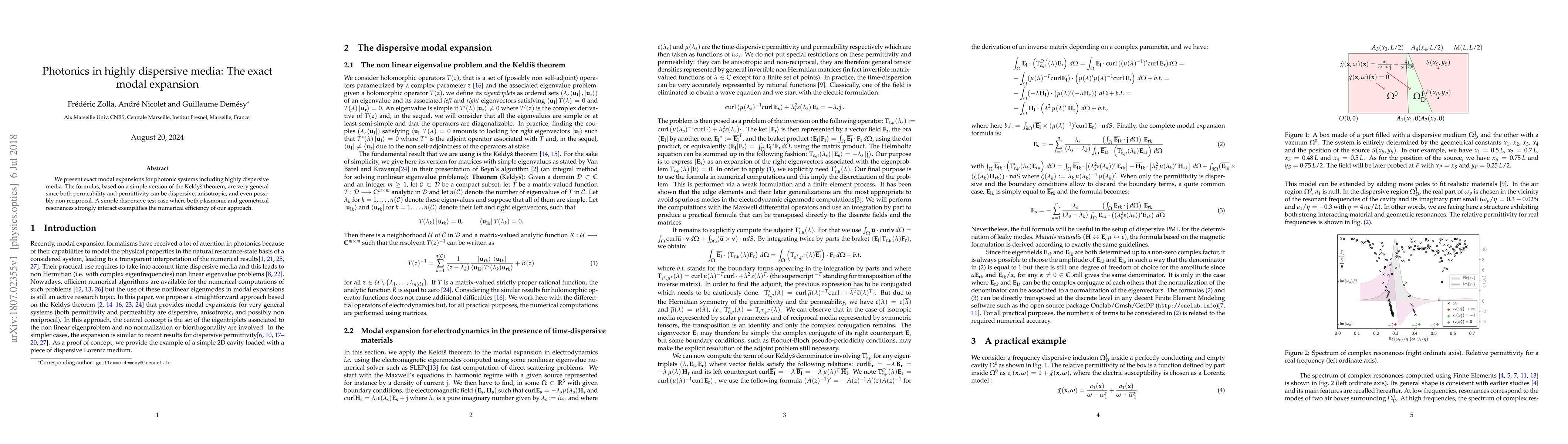 We present exact modal expansions for photonic systems including highly dispersive media. The formulas, based on a simple version of the Keldysh theorem, are very general since both permeability and permittivity can be dispersive, anisotropic, and even possibly non reciprocal. A simple dispersive test case where both plasmonic and geometrical resonances strongly interact exemplifies the numerical efficiency of our approach.