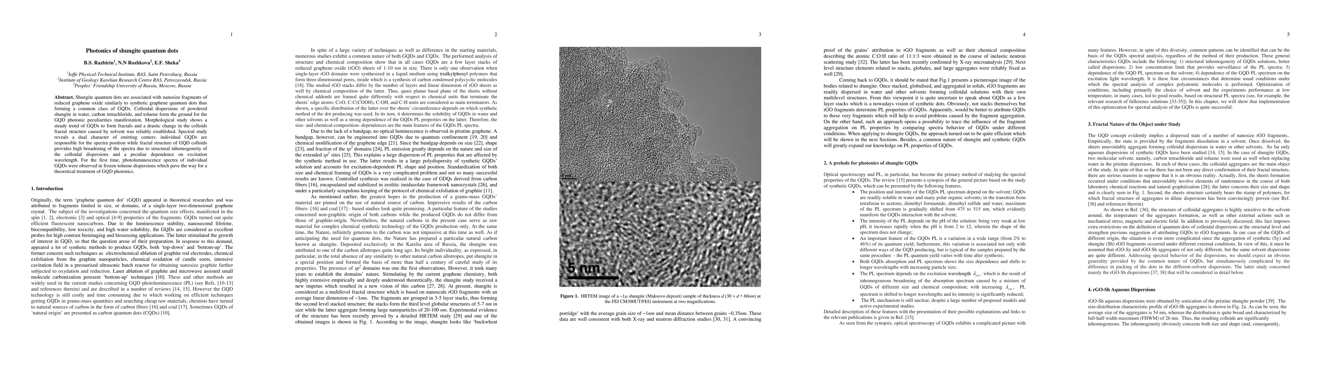 Shungite quantum dots (GQDs), akin to synthetic graphene quantum dots, exhibit photonic properties when dispersed in various solvents. The study reveals that GQDs tend to form fractal structures, which significantly influence their spectral characteristics, leading to unique photoluminescence behaviors depending on the solvent and excitation wavelength.