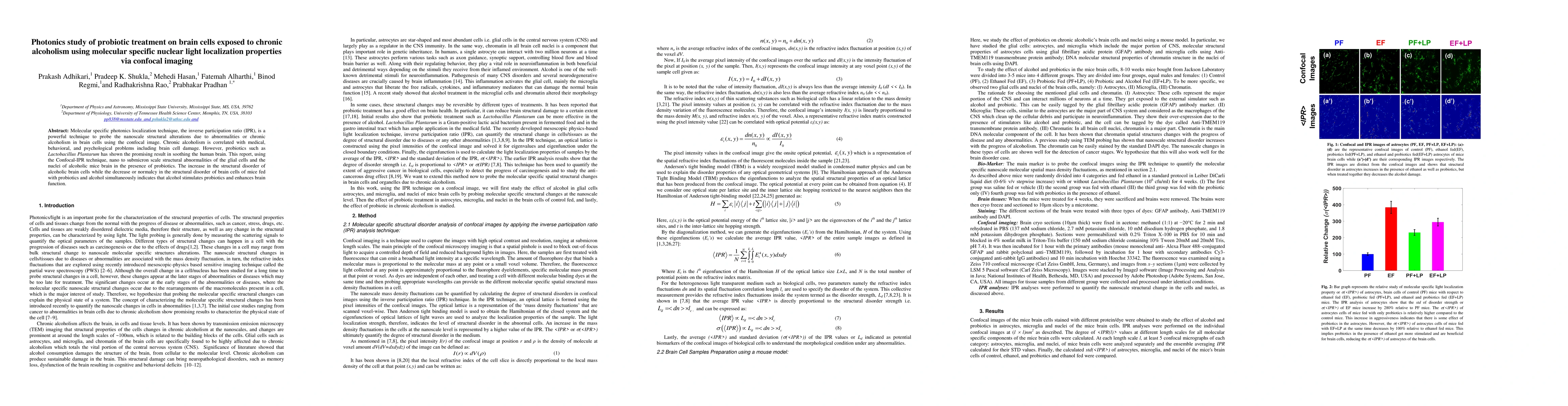 This study uses molecular specific photonics localization, specifically the inverse participation ratio (IPR), to examine nanoscale structural changes in brain cells of alcoholic mice, revealing that probiotics like Lactobacillus Plantarum can mitigate these abnormalities, suggesting a beneficial effect on brain function.