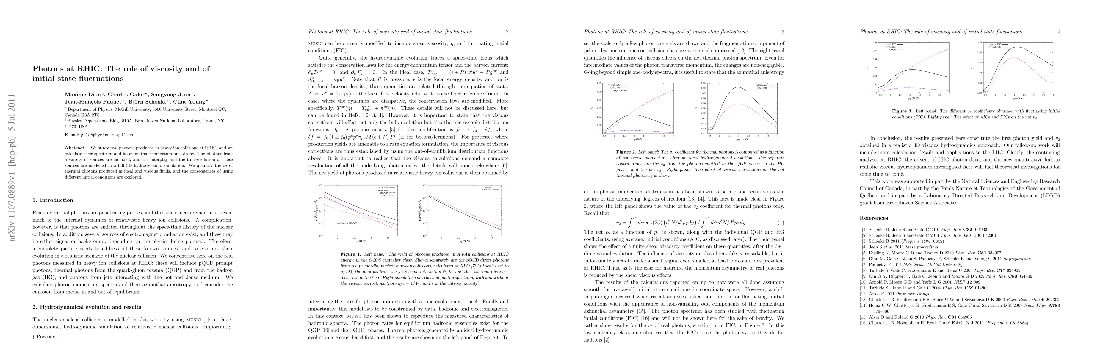We study real photons produced in heavy ion collisions at RHIC, and we calculate their spectrum and its azimuthal momentum anisotropy. The photons from a variety of sources are included, and the interplay and the time-evolution of those sources are modelled in a full 3D hydrodynamic simulation. We quantify the v_2 of thermal photons produced in ideal and viscous fluids, and the consequences of using different initial conditions are explored.