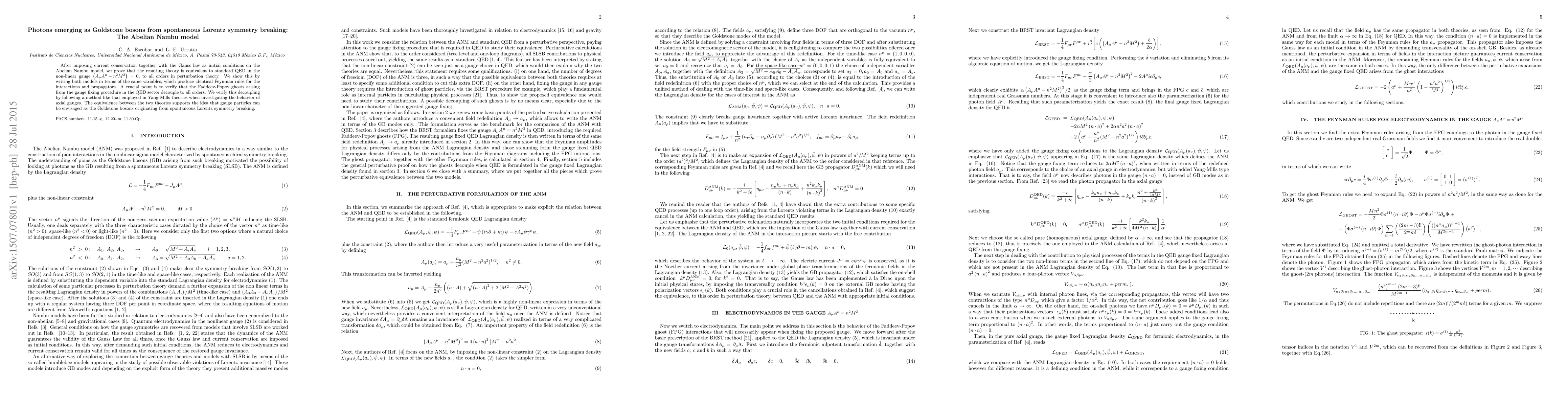 This paper demonstrates the equivalence between the Abelian Nambu model and standard QED in a non-linear gauge, showing that photons emerge as Goldstone bosons from spontaneous Lorentz symmetry breaking. The study verifies the decoupling of Faddeev-Popov ghosts, supporting the idea of gauge particles as symmetry-breaking Goldstone bosons.