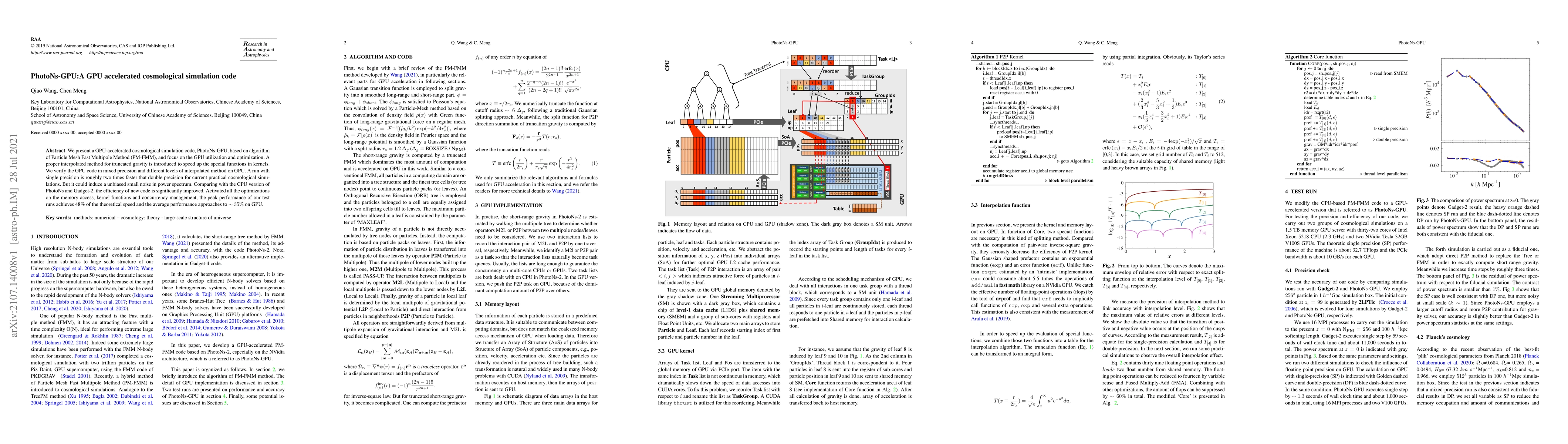 PhotoNs-GPU is a GPU-accelerated cosmological simulation code utilizing the Particle Mesh Fast Multipole Method (PM-FMM) for enhanced GPU performance. The code achieves significant speedups, especially in single precision, though it introduces minor noise in power spectrum, and outperforms CPU versions in terms of efficiency.