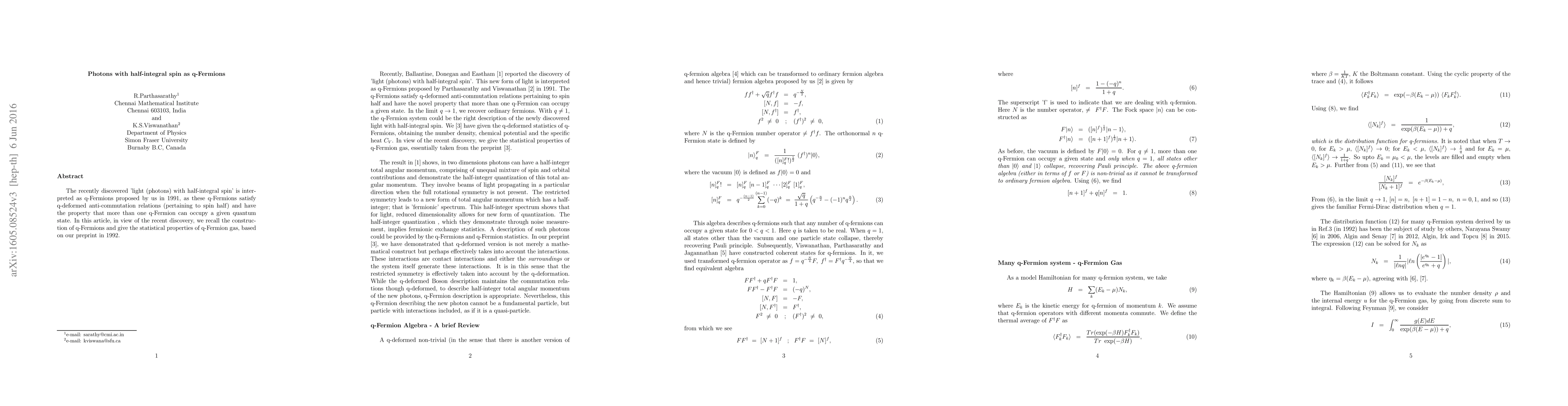 The paper proposes that photons with half-integral spin can be interpreted as q-Fermions, a concept introduced by the authors in 1991. These q-Fermions adhere to q-deformed anti-commutation relations and allow multiple particles to occupy the same quantum state, with statistical properties of a q-Fermion gas discussed.