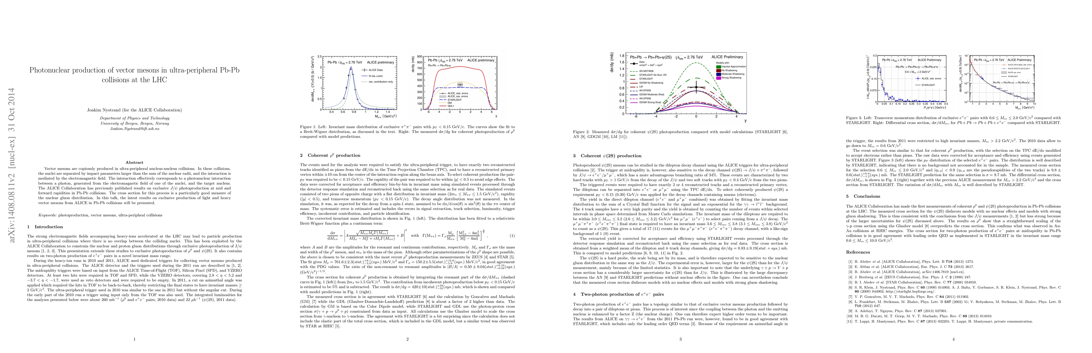 This paper discusses the production of vector mesons via photonuclear interactions in ultra-peripheral Pb-Pb collisions at the LHC, where electromagnetic fields mediate the interaction. The ALICE Collaboration presents the latest results on exclusive production of light and heavy vector mesons, providing insights into the nuclear gluon distribution.