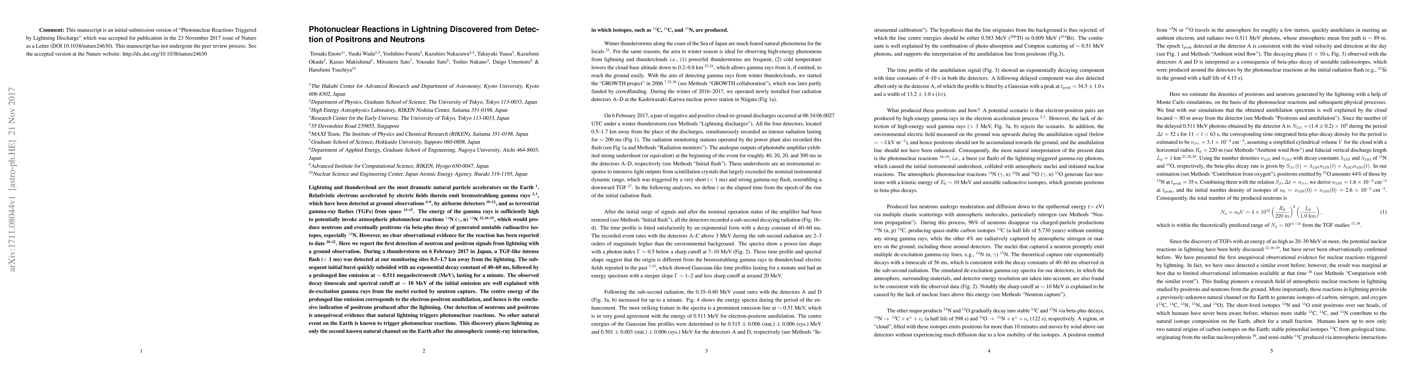 Lightning and thundercloud are the most dramatic natural particle accelerators on the Earth. Relativistic electrons accelerated by electric fields therein emit bremsstrahlung gamma rays, which have been detected at ground observations, by airborne detectors, and as terrestrial gamma-ray flashes (TGFs) from space. The energy of the gamma rays is sufficiently high to potentially invoke atmospheric photonuclear reactions 14N(gamma, n)13N, which would produce neutrons and eventually positrons via beta-plus decay of generated unstable radioactive isotopes, especially 13N. However, no clear observational evidence for the reaction has been reported to date. Here we report the first detection of neutron and positron signals from lightning with a ground observation. During a thunderstorm on 6 February 2017 in Japan, a TGF-like intense flash (within 1 ms) was detected at our monitoring sites 0.5-1.7 km away from the lightning. The subsequent initial burst quickly subsided with an exponential decay constant of 40-60 ms, followed by a prolonged line emission at about 0.511 megaelectronvolt (MeV), lasting for a minute. The observed decay timescale and spectral cutoff at about 10 MeV of the initial emission are well explained with de-excitation gamma rays from the nuclei excited by neutron capture. The centre energy of the prolonged line emission corresponds to the electron-positron annihilation, and hence is the conclusive indication of positrons produced after the lightning. Our detection of neutrons and positrons is unequivocal evidence that natural lightning triggers photonuclear reactions. No other natural event on the Earth is known to trigger photonuclear reactions. This discovery places lightning as only the second known natural channel on the Earth after the atmospheric cosmic-ray interaction, in which isotopes, such as 13C, 14C, and 15N, are produced.