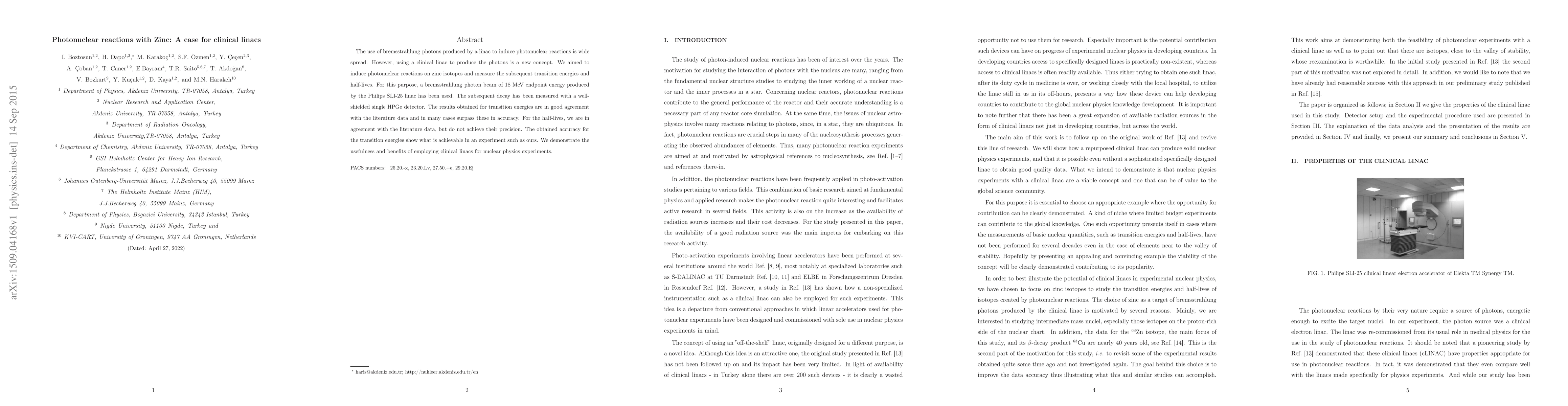 The research utilized a clinical linac to induce photonuclear reactions on zinc isotopes, measuring transition energies and half-lives. Findings show accurate agreement with literature data for transition energies, demonstrating the potential of clinical linacs for precise nuclear physics experiments.