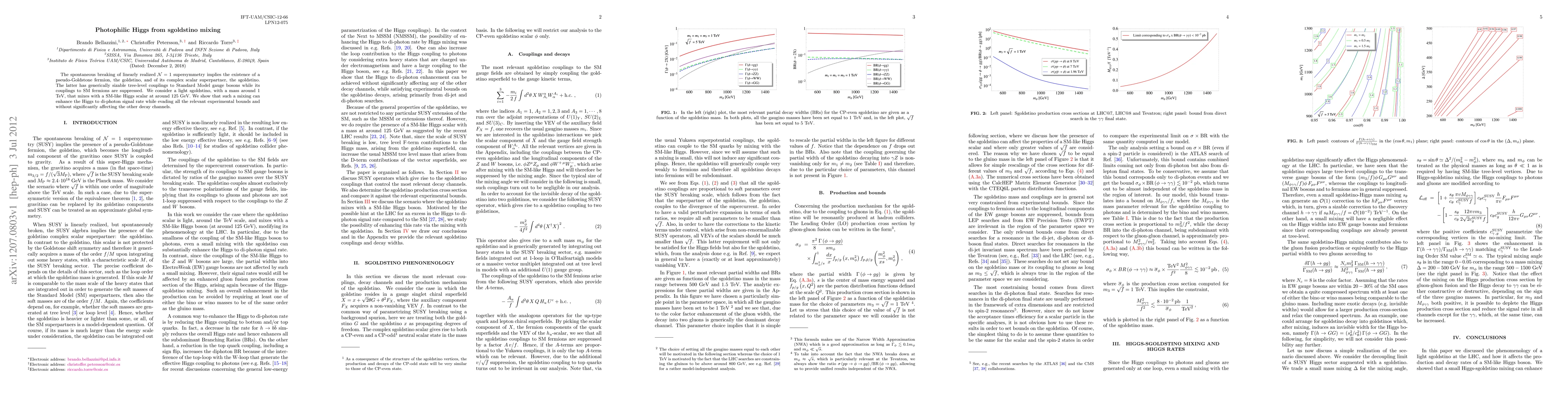 The spontaneous breaking of linearly realized N=1 supersymmetry implies the existence of a pseudo-Goldstone fermion, the goldstino, and of its complex scalar superpartner, the sgoldstino. The latter has generically sizable tree-level couplings to Standard Model gauge bosons while its couplings to SM fermions are suppressed. We consider a light sgoldstino, with a mass around 1 TeV, that mixes with a SM-like Higgs scalar at around 125 GeV. We show that such a mixing can enhance the Higgs to di-photon signal rate while evading all the relevant experimental bounds and without significantly affecting the other decay channels.