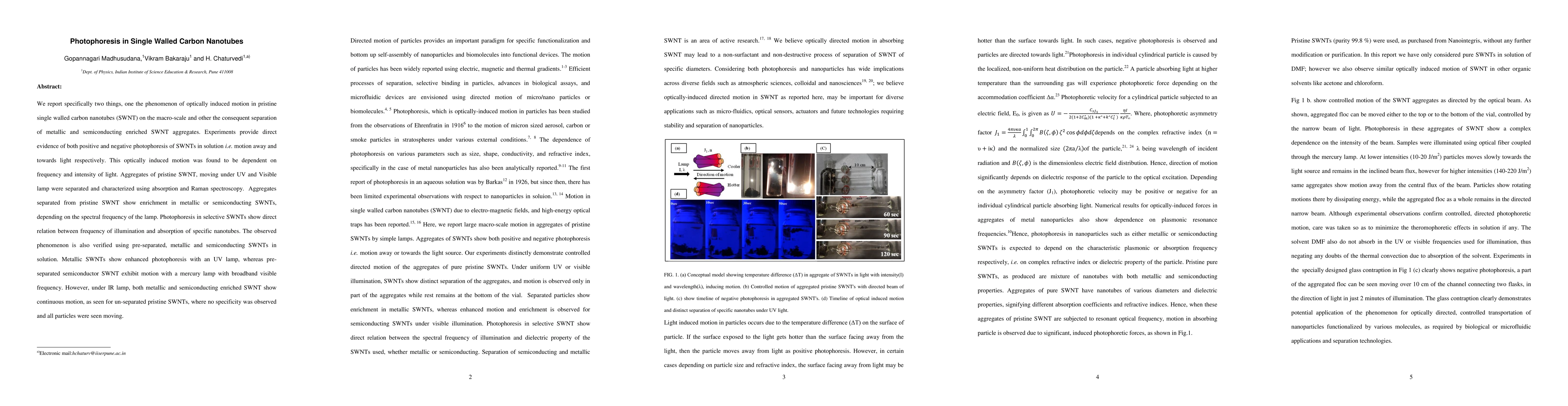 This study demonstrates optically induced motion in single-walled carbon nanotubes (SWNTs) leading to the separation of metallic and semiconducting aggregates based on photophoresis, showing distinct behaviors dependent on light frequency and intensity. The separation effectiveness varies with the spectral frequency of the light source, highlighting a direct relationship between the frequency of illumination and the absorption properties of the specific SWNTs.
