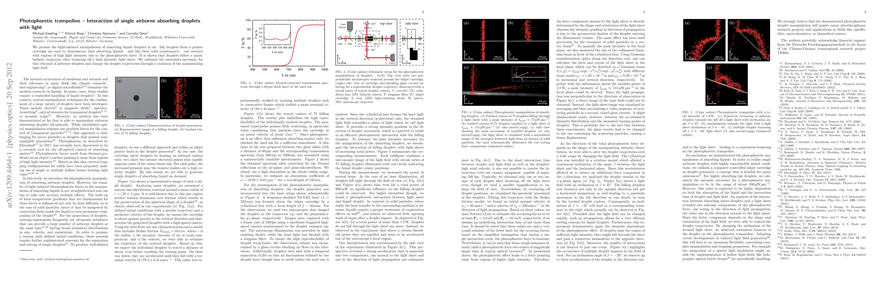 This paper demonstrates the manipulation of airborne absorbing liquid droplets using light-induced photophoretic forces, showing that droplets rebound off high-intensity light sheets and follow quasi-ballistic trajectories. The study estimates required light intensities and explores altering droplet paths via varying light fields.