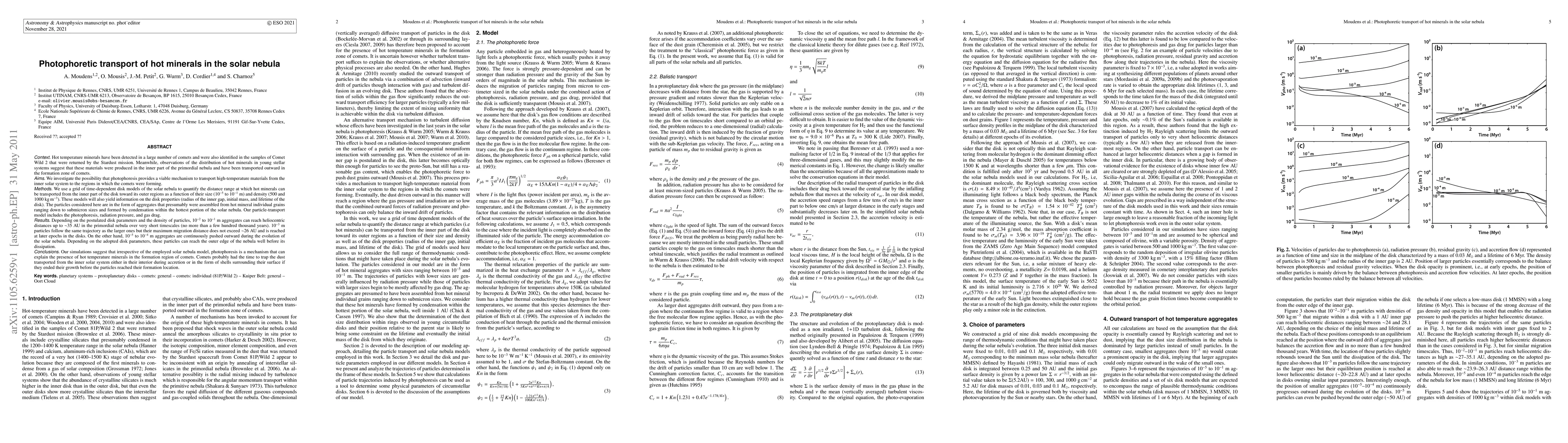 This paper investigates the photophoretic transport of hot minerals in the solar nebula, suggesting that photophoresis can move high-temperature aggregates from the inner solar system to comet-forming regions. Simulations show that aggregates of 10-2 to 10-1 m can migrate up to 35 AU, while smaller aggregates reach up to 26 AU, supporting the theory that photophoresis explains the presence of hot minerals in comets.