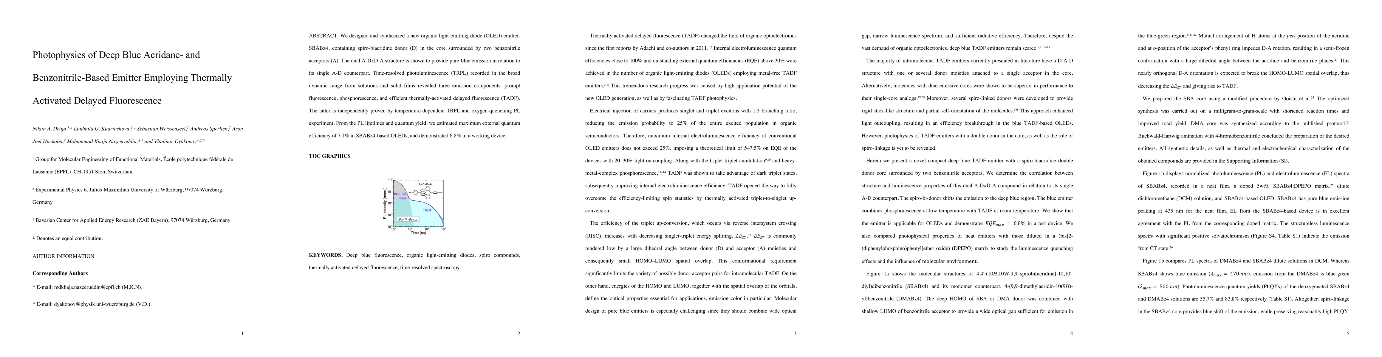 This paper reports on the design and synthesis of a new OLED emitter, SBABz4, featuring a spiro-biacridine donor core and benzonitrile acceptors, which exhibits pure-blue emission and incorporates thermally activated delayed fluorescence (TADL). The study demonstrates a maximum external quantum efficiency of 7.1% and achieves 6.8% in a functional device.
