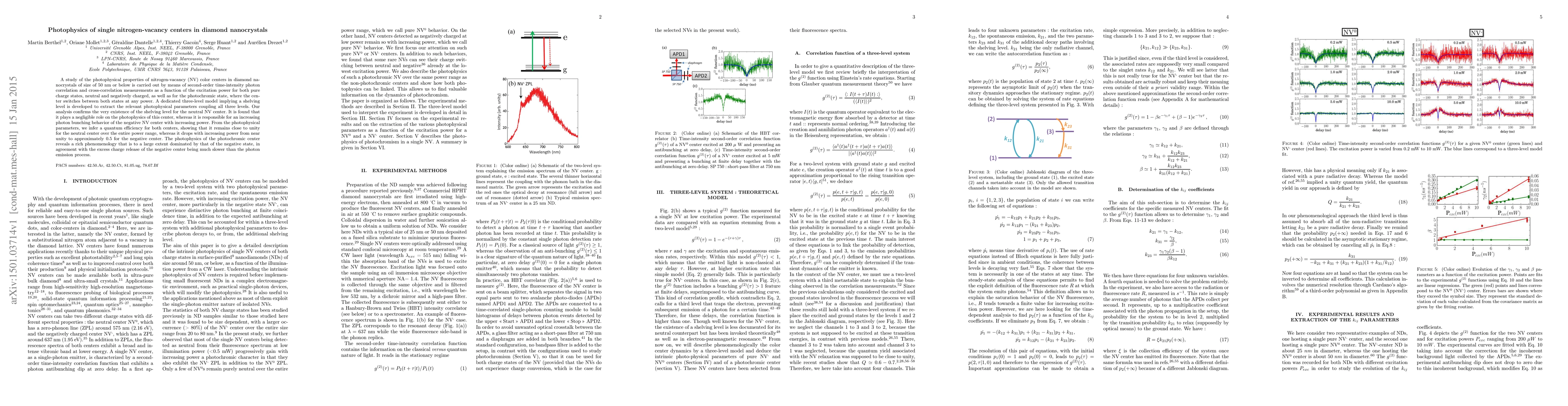 A study of the photophysical properties of nitrogen-vacancy (NV) color centers in diamond nanocrystals of size of 50~nm or below is carried out by means of second-order time-intensity photon correlation and cross-correlation measurements as a function of the excitation power for both pure charge states, neutral and negatively charged, as well as for the photochromic state, where the center switches between both states at any power. A dedicated three-level model implying a shelving level is developed to extract the relevant photophysical parameters coupling all three levels. Our analysis confirms the very existence of the shelving level for the neutral NV center. It is found that it plays a negligible role on the photophysics of this center, whereas it is responsible for an increasing photon bunching behavior of the negative NV center with increasing power. From the photophysical parameters, we infer a quantum efficiency for both centers, showing that it remains close to unity for the neutral center over the entire power range, whereas it drops with increasing power from near unity to approximately 0.5 for the negative center. The photophysics of the photochromic center reveals a rich phenomenology that is to a large extent dominated by that of the negative state, in agreement with the excess charge release of the negative center being much slower than the photon emission process.