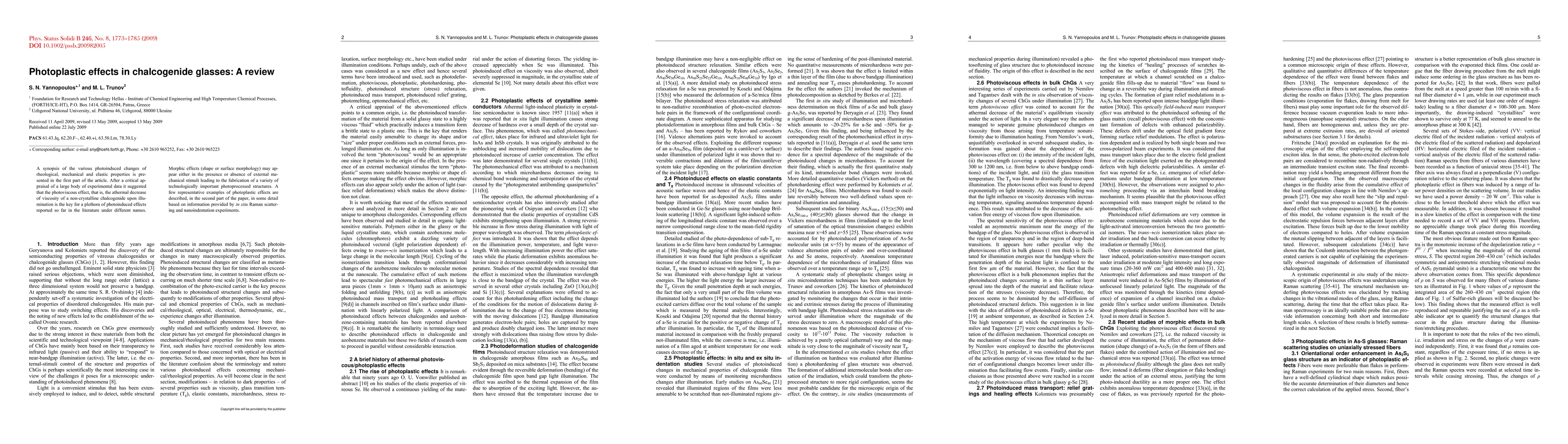 A synopsis of the various photoinduced changes of rheological, mechanical and elastic properties is presented in the first part of the article. After a critical appraisal of a large body of experimental data it suggested that the photoviscous effect, that is, the athermal decrease of viscosity of a non-crystalline chalcogenide upon illumination is the key for a plethora of photoinduced effects reported so far in the literature under different names. Morphic effects (shape or surface morphology) may ap-pear either in the presence or absence of external mechanical stimuli leading to the fabrication of a variety of technologically important photoprocessed structures. A few representative examples of photoplastic effects are described, in the second part of the paper, in some detail based on information provided by in situ Raman scattering and nanoindentation experiments.