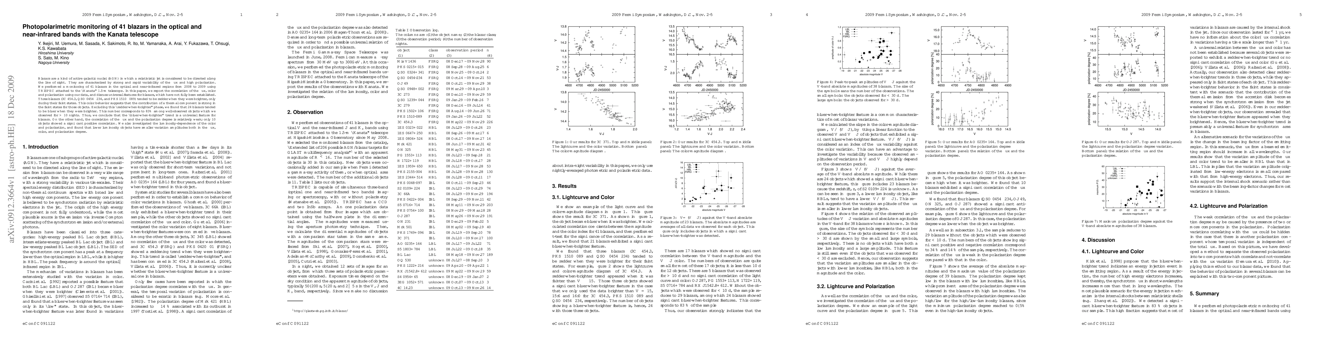 Blazars are a kind of active galactic nuclei (AGN) in which a relativistic jet is considered to be directed along the line of sight. They are characterized by strong and rapid variability of the flux and high polarization. We performed a monitoring of 41 blazars in the optical and near-infrared regions from 2008 to 2009 using TRISPEC attached to the "Kanata" 1.5-m telescope. In this paper, we report the correlation of the flux, color and polarization using our data, and discuss universal features for blazars, which have not fully been established. Three blazars (3C 454.3, QSO 0454$-$234, and PKS 1510$-$089) tended to be redder when they were brighter, only during their faint states. This color behavior suggests that the contribution of a thermal component is strong in the faint states for those objects. Excluding this "redder-when-brighter" phase, we found that 24 blazars tended to be bluer when they were brighter. This number corresponds to 83% among well-observed objects which we observed for $>10$ nights. Thus, we conclude that the "bluer-when-brighter" trend is a universal feature for blazars. On the other hand, the correlation of the flux and the polarization degree is relatively weak; only 10 objects showed a significant positive correlation. We also investigated the luminosity-dependence of the color and polarization, and found that lower luminosity objects have smaller variation amplitudes both in the flux, color, and polarization degree.