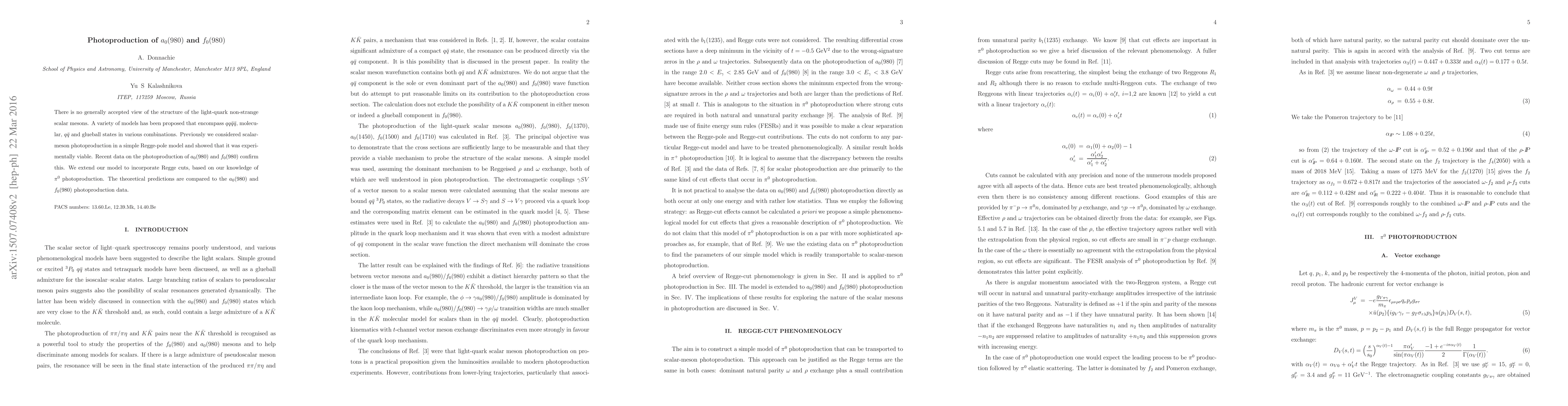 There is no generally accepted view of the structure of the light-quark non-strange scalar mesons. A variety of models have been proposed that encompass $qq\bar{q}\bar{q}$, molecular, $q\bar{q}$ and glueball states in various combinations. Previously we considered scalar-meson photoproduction in a simple Regge-pole model and showed that it was experimentally viable. Recent data on the photoproduction of $a_0(980)$ and $f_0(980)$ confirm this. We extend our model to incorporate Regge cuts, based on our knowledge of $\pi^0$ photoproduction. The theoretical predictions are compared to the $a_0(980)$ and $f_0(980)$ photoproduction data.
