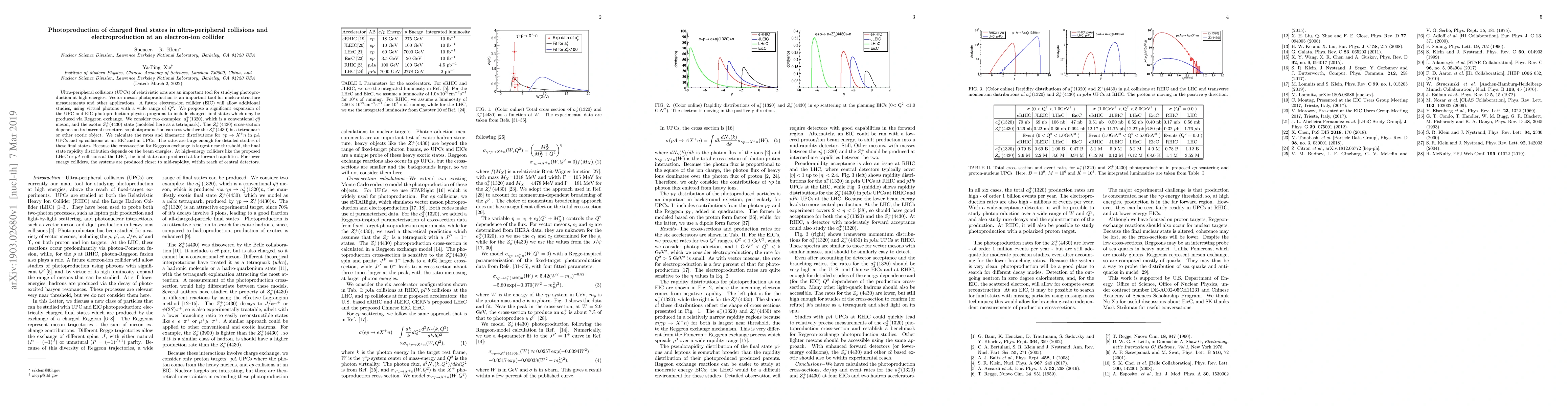 This paper proposes expanding photoproduction studies in ultra-peripheral ion collisions and future electron-ion colliders to include charged final states like $a_2^+(1320)$ and $Z_c^+(4430)$. The study calculates production rates and distributions, showing that these final states are sufficiently abundant for detailed investigation, with the final state rapidity distribution varying with beam energy.
