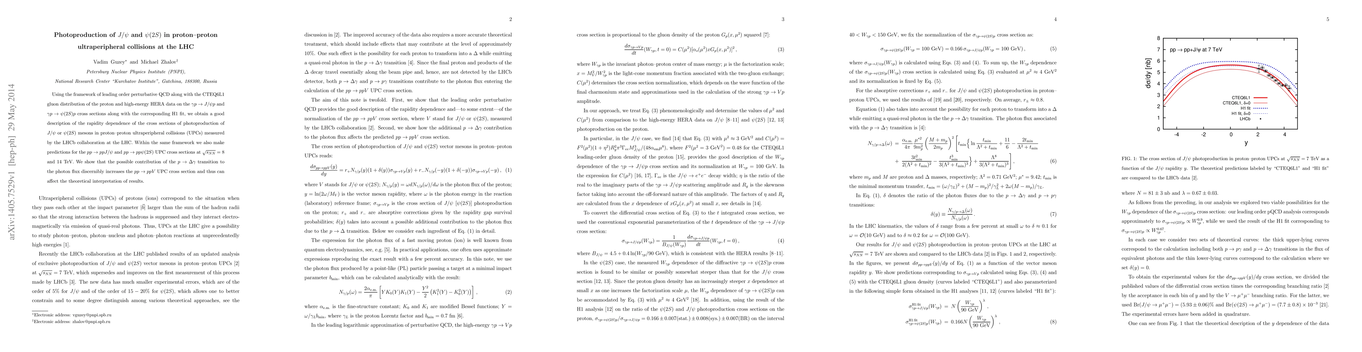 Using the framework of leading order perturbative QCD along with the CTEQ6L1 gluon distribution of the proton and high-energy HERA data on the $\gamma p \to J/\psi p$ and $\gamma p \to \psi(2S) p$ cross sections along with the corresponding H1 fit, we obtain a good description of the rapidity dependence of the cross sections of photoproduction of $J/\psi$ or $\psi(2S)$ mesons in proton--proton ultraperipheral collisions (UPCs) measured by the LHCb collaboration at the LHC. Within the same framework we also make predictions for the $pp \to pp J/\psi$ and $pp \to pp \psi(2S)$ UPC cross sections at $\sqrt{s_{NN}}=8$ and 14 TeV. We show that the possible contribution of the $p \to \Delta \gamma$ transition to the photon flux discernibly increases the $pp \to ppV$ UPC cross section and thus can affect the theoretical interpretation of results.