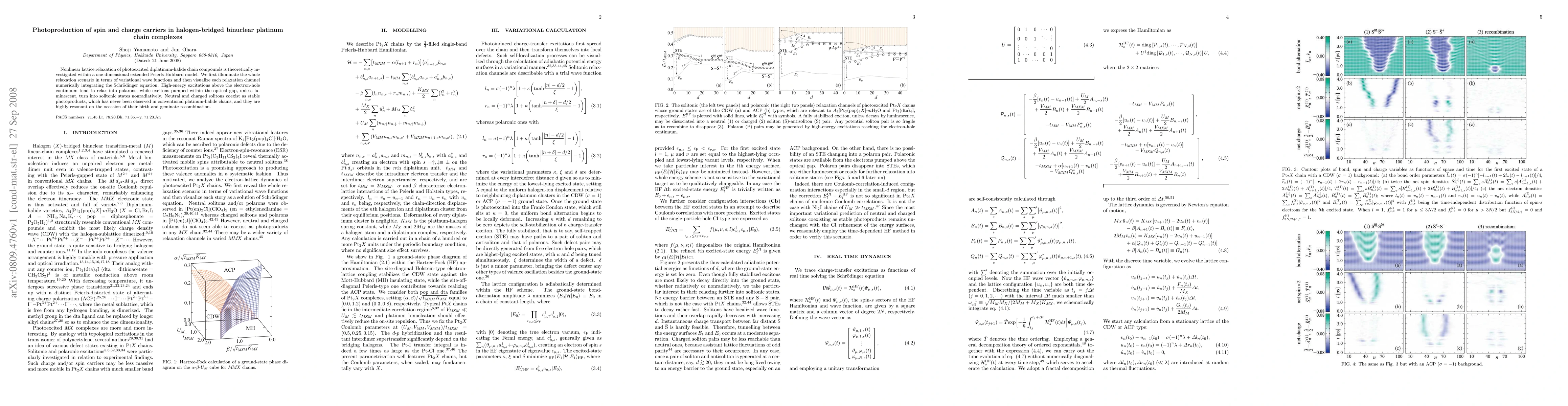 Nonlinear lattice relaxation of photoexcited diplatinum-halide chain compounds is theoretically investigated within a one-dimensional extended Peierls-Hubbard model. We first illuminate the whole relaxation scenario in terms of variational wave functions and then visualize each relaxation channel numerically integrating the Schr\"odinger equation. High-energy excitations above the electron-hole continuum tend to relax into polarons, while excitons pumped within the optical gap, unless luminescent, turn into solitonic states nonradiatively. Neutral and charged solitons coexist as stable photoproducts, which has never been observed in conventional platinum-halide chains, and they are highly resonant on the occasion of their birth and geminate recombination.