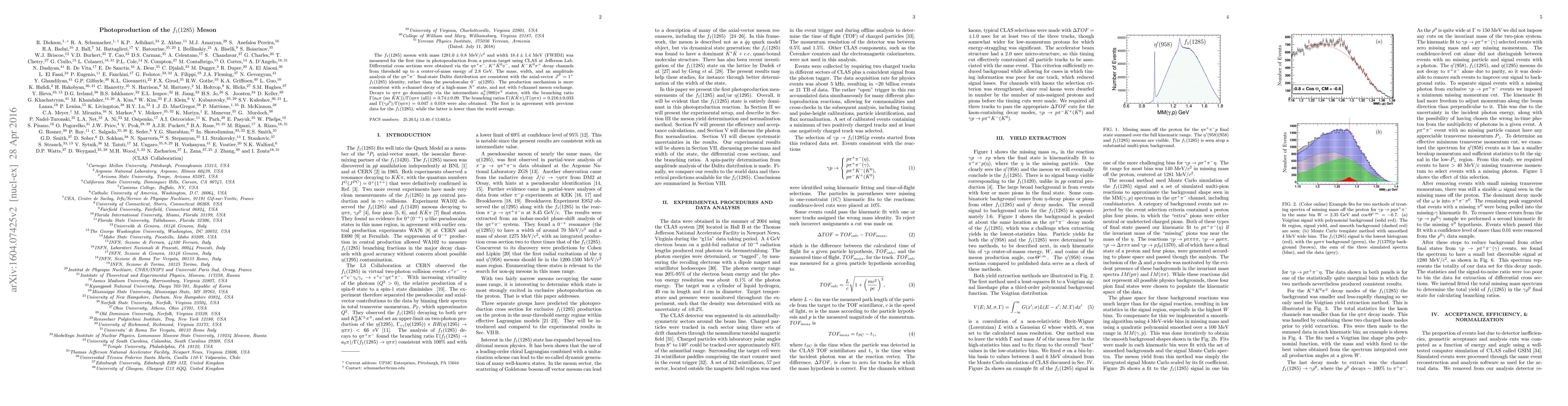 The $f_1(1285)$ meson with mass $1281.0 \pm 0.8$ MeV/$c^2$ and width $18.4 \pm 1.4$ MeV (FWHM) was measured for the first time in photoproduction from a proton target using CLAS at Jefferson Lab. Differential cross sections were obtained via the $\eta\pi^{+}\pi^{-}$, $K^+\bar{K}^0\pi^-$, and $K^-K^0\pi^+$ decay channels from threshold up to a center-of-mass energy of 2.8 GeV. The mass, width, and an amplitude analysis of the $\eta\pi^{+}\pi^{-}$ final-state Dalitz distribution are consistent with the axial-vector $J^P=1^+$ $f_1(1285)$ identity, rather than the pseudoscalar $0^-$ $\eta(1295)$. The production mechanism is more consistent with $s$-channel decay of a high-mass $N^*$ state, and not with $t$-channel meson exchange. Decays to $\eta\pi\pi$ go dominantly via the intermediate $a_0^\pm(980)\pi^\mp$ states, with the branching ratio $\Gamma(a_0\pi \text{ (no} \bar{K} K\text{)}) / \Gamma(\eta\pi\pi \text{(all)}) = 0.74\pm0.09$. The branching ratios $\Gamma(K \bar{K} \pi)/\Gamma(\eta\pi\pi) = 0.216\pm0.033$ and $\Gamma(\gamma\rho^0)/\Gamma(\eta\pi\pi) = 0.047\pm0.018$ were also obtained. The first is in agreement with previous data for the $f_1(1285)$, while the latter is lower than the world average.
