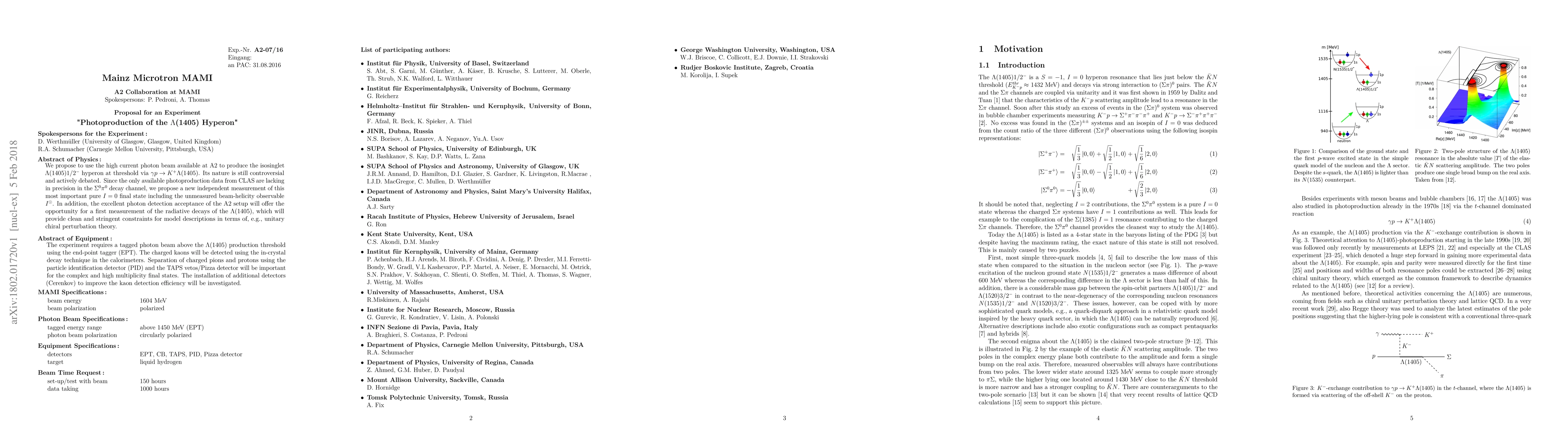 We propose to use the high current photon beam available at A2 to produce the isosinglet $\Lambda(1405)1/2^-$ hyperon at threshold via $\gamma p\rightarrow K^+\Lambda(1405)$. Its nature is still controversial and actively debated. Since the only available photoproduction data from CLAS are lacking in precision in the $\Sigma^0\pi^0$ decay channel, we propose a new independent measurement of this most important pure $I = 0$ final state including the unmeasured beam-helicity observable $I^\odot$. In addition, the excellent photon detection acceptance of the A2 setup will offer the opportunity for a first measurement of the radiative decays of the $\Lambda(1405)$, which will provide clean and stringent constraints for model descriptions in terms of, e.g., unitary chiral perturbation theory.