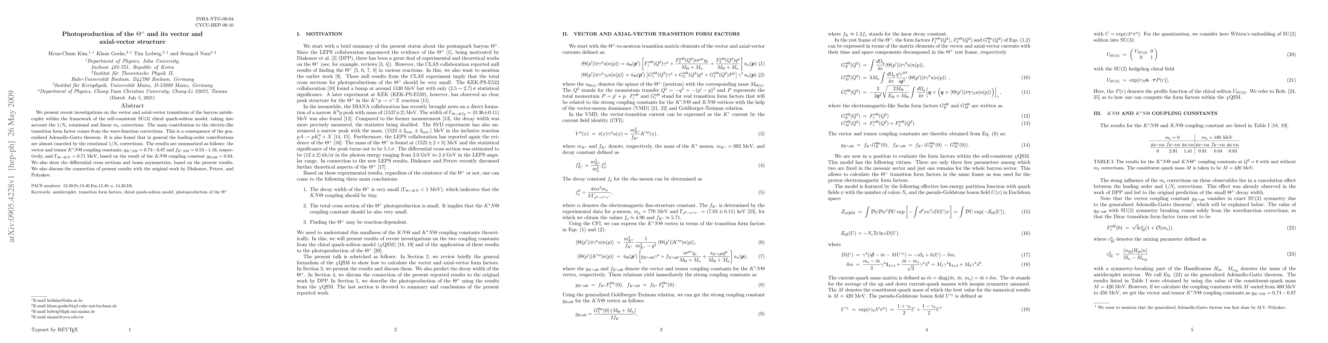 We present recent investigations on the vector and axial-vector transitions of the baryon antidecuplet within the framework of the self-consistent SU(3) chiral quark-soliton model, taking into account the 1/N_c rotational and linear m_s corrections. The main contribution to the electric-like transition form factor comes from the wave-function corrections. This is a consequence of the generalized Ademollo-Gatto theorem. It is also found that in general the leading-order contributions are almost canceled by the rotational 1/N_c corrections. The results are summarized as follows: the vector and tensor K^*-N-Theta coupling constants, g_{K^*-N-Theta}=0.74 - 0.87 and f_{K^*-N-Theta}=0.53 - 1.16, respectively, and Gamma_{Theta->KN}=0.71 MeV, based on the result of the K-N-Theta coupling constant g_{K-n-Theta}=0.83. We also show the differential cross sections and beam asymmetries, based on the present results. We also discuss the connection of present results with the original work by Diakonov, Petrov, and Polyakov.