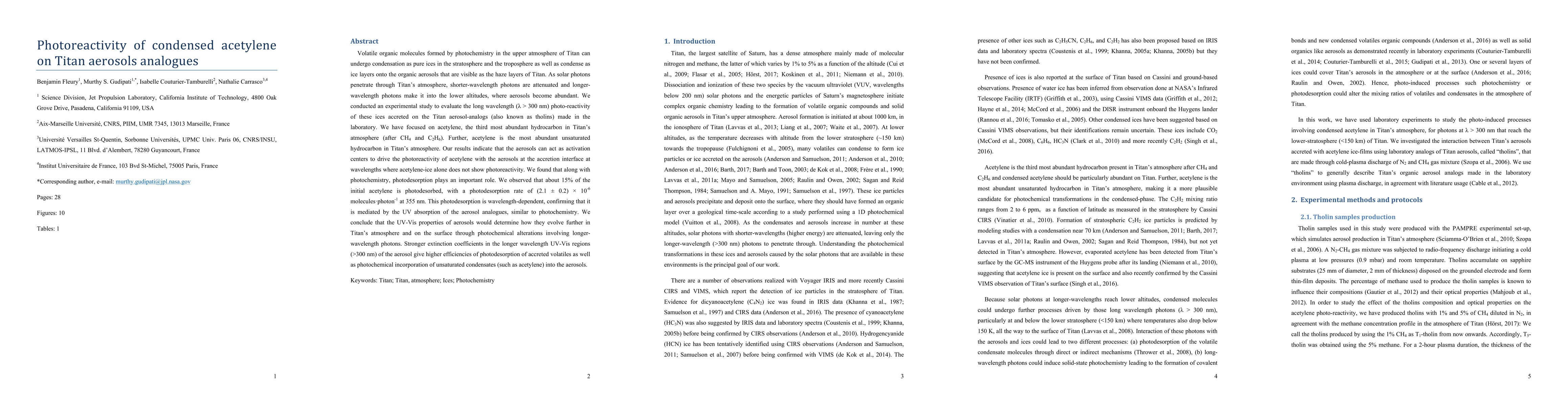 Volatile organic molecules formed by photochemistry in the upper atmosphere of Titan can undergo condensation as pure ices in the stratosphere and the troposphere as well as condense as ice layers onto the organic aerosols that are visible as the haze layers of Titan. As solar photons penetrate through Titan s atmosphere, shorter-wavelength photons are attenuated and longerwavelength photons make it into the lower altitudes, where aerosols become abundant. We conducted an experimental study to evaluate the long wavelength ( > 300 nm) photo-reactivity of these ices accreted on the Titan aerosol-analogs (also known as tholins) made in the laboratory. We have focused on acetylene, the third most abundant hydrocarbon in Titan s atmosphere after CH4 and C2H6. Further, acetylene is the most abundant unsaturated hydrocarbon in Titan s atmosphere. Our results indicate that the aerosols can act as activation centers to drive the photoreactivity of acetylene with the aerosols at the accretion interface at wavelengths where acetylene-ice alone does not show photoreactivity. We found that along with photochemistry, photodesorption plays an important role. We observed that about 15% of the initial acetylene is photodesorbed, with a photodesorption rate of (2.1 +/- 0.2) x 10-6 molecules.photon-1 at 355 nm. This photodesorption is wavelength-dependent, confirming that it is mediated by the UV absorption of the aerosol analogues, similar to photochemistry. We conclude that the UV-Vis properties of aerosols would determine how they evolve further in Titan s atmosphere and on the surface through photochemical alterations involving longer wavelength photons.