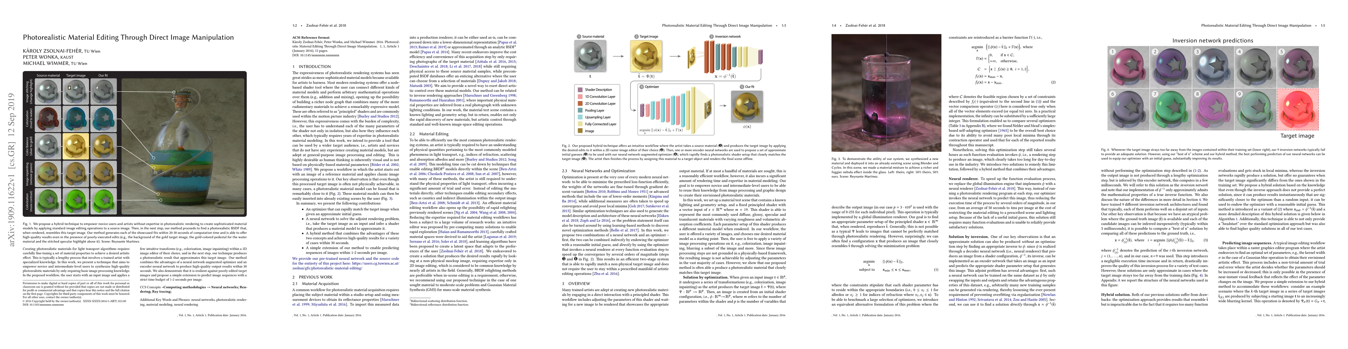 Creating photorealistic materials for light transport algorithms requires carefully fine-tuning a set of material properties to achieve a desired artistic effect. This is typically a lengthy process that involves a trained artist with specialized knowledge. In this work, we present a technique that aims to empower novice and intermediate-level users to synthesize high-quality photorealistic materials by only requiring basic image processing knowledge. In the proposed workflow, the user starts with an input image and applies a few intuitive transforms (e.g., colorization, image inpainting) within a 2D image editor of their choice, and in the next step, our technique produces a photorealistic result that approximates this target image. Our method combines the advantages of a neural network-augmented optimizer and an encoder neural network to produce high-quality output results within 30 seconds. We also demonstrate that it is resilient against poorly-edited target images and propose a simple extension to predict image sequences with a strict time budget of 1-2 seconds per image.