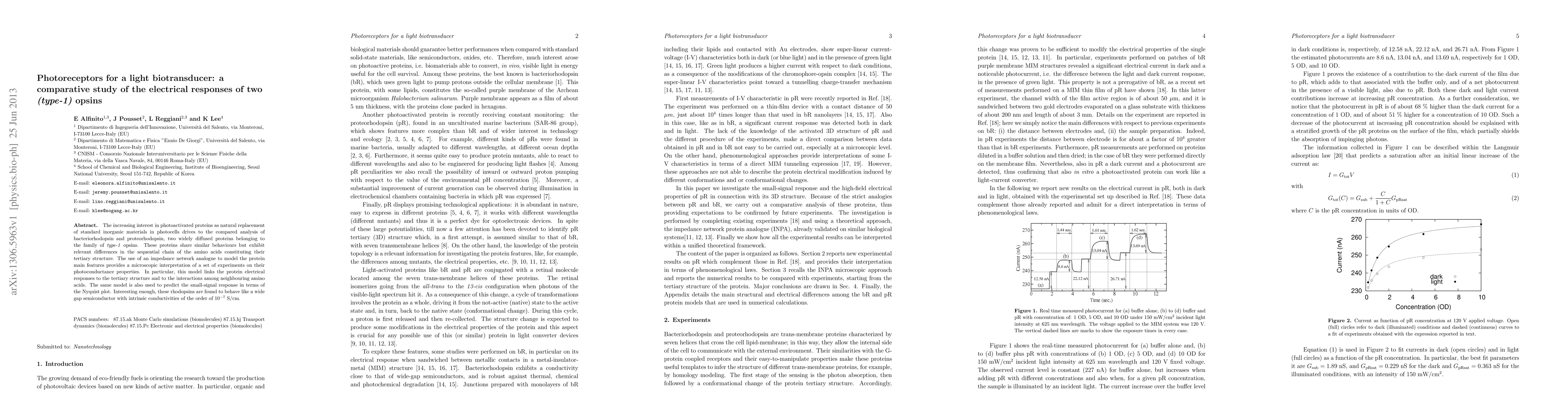 The increasing interest in photoactivated proteins as natural replacement of standard inorganic materials in photocells drives to the compared analysis of bacteriorhodopsin and proteorhodopsin, two widely diffused proteins belonging to the family of \textit{type-1} opsins. These proteins share similar behaviours but exhibit relevant differences in the sequential chain of the amino acids constituting their tertiary structure. The use of an impedance network analogue to model the protein main features provides a microscopic interpretation of a set of experiments on their photoconductance properties. In particular, this model links the protein electrical responses to the tertiary structure and to the interactions among neighbouring amino acids. The same model is also used to predict the small-signal response in terms of the Nyquist plot. Interesting enough, these rhodopsins are found to behave like a wide gap semiconductor with intrinsic conductivities of the order of $10^{-7}$ S/cm.