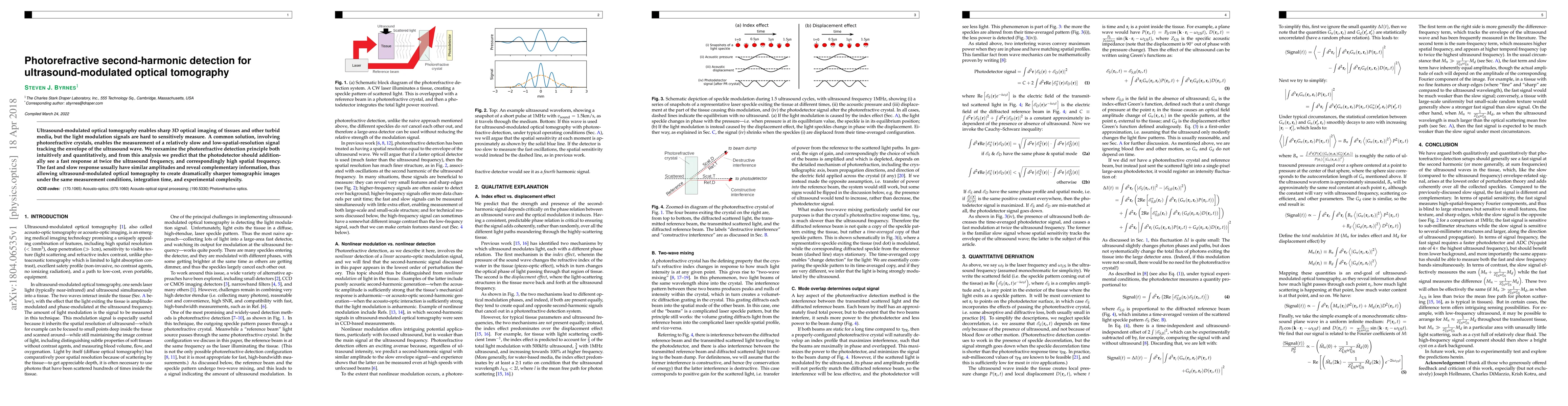 This paper proposes a novel photorefractive second-harmonic detection method to enhance ultrasound-modulated optical tomography, predicting that it will yield sharper 3D images by capturing both fast and slow modulation signals at twice the ultrasound frequency. This dual-signal approach promises improved spatial resolution without increasing measurement complexity.